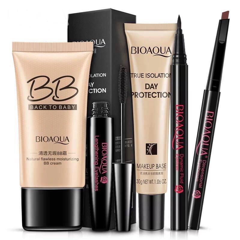 - Xuất xứ : Nội địa Trung 1. Chì kẻ chân mày Bioaqua : đầu chì dạng ngang định dạng chân mày, cọ bột giúp tán đều cho nét mày đầy đặn, tự nhiên, mềm mại. 2. Mascara Bioaqua: đầu cọ mới vuốt mi cong vút 100º, chải từng sợi cho mi tơi, dày đều. Dạng gel đặc biệt, nhẹ, mượt giữ mi cong suốt 18h, mi dày gấp 3 lần, không vón cục, không lem, không trôi. 3. Bút kẻ mắt BIOAQUA : cải tiến với đầu cọ sắc nét chỉ 0.01mm, cực kì linh hoạt giúp bạn dễ dàng vẽ mắt từ nét mỏng tự nhiên đến dày cá tính. Công nghệ màng phim độc đáo không lem, không trôi suốt 17 giờ lại hoàn toàn dễ tẩy trang. 4. Kem nền cao cấp BB : Sản phẩm được sản xuất theo công thức đặc biệt cho lớp kem nền trang điểm siêu mỏng, mịn mà vẫn giúp che phủ khuyết điểm trên da, cho làn da hoàn hảo, sáng mịn màng không tì vết. Sản phẩm còn hỗ trợ chống nắng ngừa da sạm nám, hư tổn do ánh nắng mặt trời và các yếu tố khác từ môi trường. 5. Kem lót BB : che phủ hoàn hảo với tác dụng 3 trong 1 vừa là phấn phủ, kem nền và vừa là kem che khuyết điểm cực tốt. Bạn sẽ không còn lo lắng về một làn da mụn hay nhiều khuyết điểm. Sản phẩm phù hợp với 3 loại da: da dầu - da thường - da hỗn hợp . #bộ trang điểm#bộ trang điểm cao cấp#bộ trang điểm lancome#bộ trang điểm hàn quốc#bộ trang điểm đầy đủ#bộ trang điểm mini