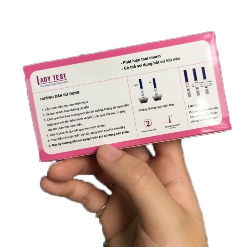 ** Que đóng gói riêng lẻ, bên trong mỗi que có gói chống ấm đảm bảo chính xác đến khi hết hạn dùng. - Thời gian đọc kết quả nhanh: chỉ cần 3-5 phút. - Thời gian phát hiện thai nhanh: chỉ cần 6-9 ngày tính từ ngày rụng trứng. - Hạn sử dụng: 03 năm kể từ ngày sản xuất, xem dưới đáy hộp **Bảo quản: Nơi khô ráo >25oC tránh ánh sáng mặt trời ** Quy cách đóng gói: 1 test phôi nhôm, 1 cốc thử thông minh kích thước đóng gói: 15x12x10cm ** Hướng dẫn sử dụng Que thử thai nhanh tại nhà LADY test + Xé bao nhôm theo đường chỉ dẫn. + Lấy mẫu thử vào cốc + Cắm test thử theo chiều mũi tên in trên test. + đến khi mẫu thử lên hết phần đọc kết quả (10 20s) đặt test thử nằm ngan trên miệng cốc. + Chờ 1 phút đọc kết quả (không đọc kết quả quá 10 phút) =============================================== ** Đọc kết quả Que thử thai Nhanh tại nhà LADY Test + Kết quả dương tính (CÓ THAI): trên que thử cùng đồng thời xuất hiện hai vạch ngang màu hồng C và T (dù đậm hay mờ). + Kết quả âm tính (KHÔNG CÓ THAI): trên que thử chỉ xuất hiện một vạch ngang màu hồng C. + Kết quả sai: nếu sau 3 phút không thấy xuất hiện vạch ngang màu hồng C trên que thử. Nguyên nhân có thể do thao tác không đúng hướng dẫn, mẫu nước tiểu không đảm bảo hoặc que thử bị hỏng. Bạn nên thử lại với que mới khác. =============================================== ** CHÚ Ý: + Yêu cầu đọc kỹ hướng dẫn sử dụng trước khi dùng. + Mẫu nước tiểu có thể lấy vào bất kỳ thời gian nào trong ngày, tuy nhiên lấy vào buổi sáng khi ngủ dậy là tốt nhất. + Không sử dụng que thử đã hết hạn dùng. Mỗi que thử chỉ sử dụng một lần. Bảo quản nơi khô ráo, nhiệt độ phòng 2-30 độ C + Tránh xa tầm tay trẻ em. + chắc chắn đã lấy đủ nước để có kết quả tránh trường hợp không lên vạch nào Chúng tôi CAM KẾT: ** Luôn tư vấn tận tâm, nhiệt tình với tâm của Dược Sĩ ** Đảm bảo tất cả sản phẩm luôn chính hãng 100%, nguồn gốc xuất xứ rõ ràng, nói không với hàng giả, hàng nhái, hàng kém chất lượng. ** Đền gấp 10 lần nếu phát hiện hàng giả ** Sản phẩm luôn có hạn sử dụng dài ** Giá cả luôn hợp lý, cạnh tranh, tiết kiệm cho Quý khách hàng.