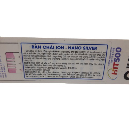 BÀN CHẢI ION – NANO BẠC Mã số: 60 Bàn chải sử dụng công nghệ NANO các phân tử BẠC phủ lên toàn bộ lông bàn chải, có sức mạnh tiêu diệt, ngăn chặn sự xâm nhập và sinh sôi của vi khuẩn lên lông bàn chải, khử mùi hôi và ngăn ngừa các bệnh về răng miệng. HDSD: rửa sạch, vẩy khô sau khi sử dụng, bảo quản nơi khô sạch, thay bàn chải 3 tháng/lần theo hướng dẫn của nha sĩ. Nhà sản xuất : LKIMEXCO., LTD . – 244 Jisam-ro, Giheung-gu, Yongin-si, Gyeonggi-do – HÀN QUỐC . Nhà NK & PP: Công ty MB ĐÔNG Á – 498 Xã Đàn, P. Nam Đồng, Q. Đống Đa, Hà Nội. Điện thoại: Trang web: mbdonga.com Email: [email protected] #banchai #danhrang #banchaidanhrang #nanosilver #banchainano #banchaihanquoc