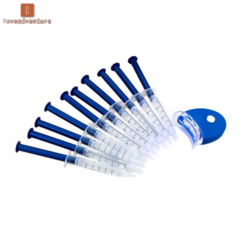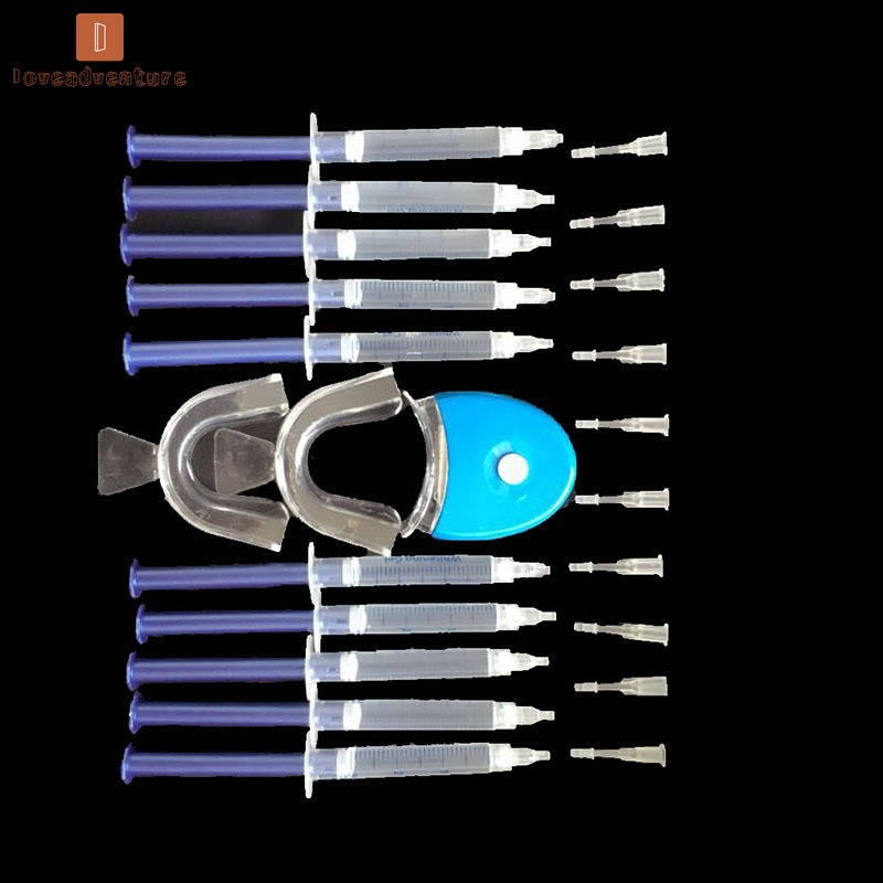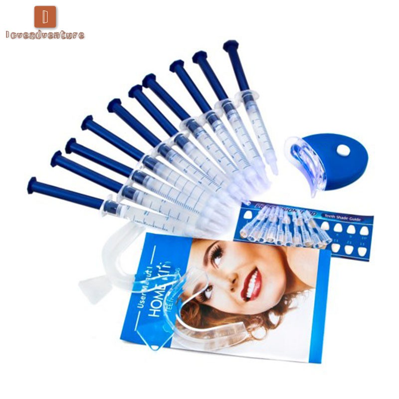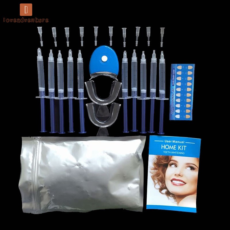 ___________________________❤welcome to loveadventure ❤_________________________ We hope you have a happy shopping in my store♬ Decription: Features: Name: Teeth Whitening Tool Kit Purpose: Whiten Teeth Material: Silicone and Plastics Effective Guaranteed Results This kit includes everything you need for a perfect bright smile. How to use: Use your dental tray to shape your own tray and place it before use 1. After cleaning the teeth (brushing teeth), wipe the surface of the teeth with a dental wipe (the use of a tooth-wipe kit to use a toothbrush before the gel is more effective, or it can be used without a tooth brush to apply the gel directly after cleaning the teeth) 2. Apply a whitening gel with a thickness of about 1mm and wear a prepared dental tray 3 turn on the blue light switch, irradiation for 10 minutes. Note: 1. Prepare 80 degrees warm water 2. Soak the tray for 2 minutes to soften it 3. Wear dental tray and bite well 4. Hand-assisted fit of the teeth 5. Trim the braces and complete the production Remarks: 1. Because the tooth whitening product contains peroxide, some individuals may have gum allergies. Do not use other tooth whitening products during the use of this product, otherwise it will increase the dental discomfort. 2. Do not eat irritating foods during use (such as over-temperature or ice-cold objects) Do not eat colored physical objects (such as fees, strong tea, chocolate, red wine, etc.) will affect the use of effects 3. The time and frequency of use vary from person to person. Mild allergies (dental sore gums) can be alleviated by reducing the time of use and once every 2-3 days. Severe burning is not a quality issue for individuals during use. When the constitution is weak, the gingival anti-allergic degree naturally decreases. In such cases, please cooperate with the anti-allergic gel or stop using it. Included: 10 x Whitening gel 1x LED white light 2x Tray 1x Attached instructions 1x Shade guide