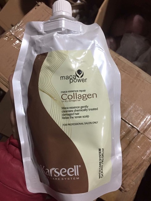 Ủ tóc Collagen Karseell là dòng sản phẩm ủ dưỡng tóc chuyên dụng có công dụng cung cấp dưỡng chất, phục hồi tóc hư tổn nhanh, với thành phần collagen giúp phục hồi độ ẩm và độ bóng mượt cho bạn mái tóc mềm, suôn mượt, bóng, óng ả chỉ sau 1 lần sử dụng. Ủ tóc Collagen Karseell dùng được cho cả nam và nữ, đặc biệt thích hợp cho các bạn sở hữu mái tóc khô, dễ gãy rụng, chẻ ngọn hoặc hư tổn do thời tiết hoặc nhuộm quá nhiều lần. Sản phẩm tuyệt đối không gây kích ứng da nên những bạn sở hữu vùng da đầu dễ hói, gãy rụng có thể yên tâm sử dụng. Thành phần của dầu ủ tóc Collagen Karseell gồm nhiều dưỡng chất như hạt macca nguyên chất, collagen tươi, protein, khoáng chất, vitamin E, dầu dừa, dầu bơ, tảo biển và tinh bột lúa mì… có tác dụng giúp nuôi dưỡng tóc từ gốc đến ngọn, phục hồi nhanh và làm chậm quá trình hư tổn của tóc. Collagen tươi cộng thêm protein mang lại công dụng phục hồi tóc hư tổn nặng, tăng liên kết cấu trúc tóc, giúp sợi tóc chắc khỏe, cung cấp độ ẩm giúp tóc hết khô xơ, hơn nữa còn giúp đào thải độc tố có trong tóc và loại bỏ các bã nhờn dư thừa trên tóc. Tóc sau khi sử dụng một lần sẽ mềm mượt, bồng bềnh hơn và thơm hơn. Cách dùng hấp tóc Collagen Karseell Tùy mức độ hư tổn mà bạn lấy một lượng vừa đủ dầu ủ tóc Collagen Karseell pha với nước ấm tỉ lệ 1:1, hòa tan, bôi đều lên tóc, quấn khăn, để tự nhiên hoặc dùng máy kích nhiệt khoảng 20 – 30 phút. Sau đó xả sạch rồi sấy khô tạo kiểu hoặc để tự nhiên. Nên sử dụng kết hợp dầu gội, xả Collagen Karseell để phát huy hiệu quả tối ưu nhất. Xuất xứ: Italia Thương hiệu: Karseell Dung lượng: 500ml Mua le 70k Sĩ 10 bịch trở lên 55k/b