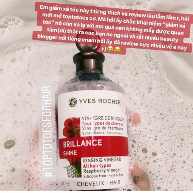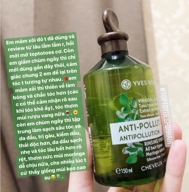 🌹🌹Giấm xả tóc Yves Rocher: 260k/150ml #toptotoesforhair #toptotoesyvesrocher (🔺 TRƯỢT ẢNH XEM CHI TIẾT🔺) - Phù hợp mọi loại tóc, no parabens, no silicone - Dùng sau khi gội sạch tóc thay cho xả hoặc dùng giữa gội và xả 🌿🌿 Dùng chất giấm hay rượu để xả tóc đã là công tức làm đẹp từ xưa ở châu Âu, nhưng thường đem đến mùi không mấy dễ chịu, hãng mp Thiên Nhiên Yves Rocher thật sự đã quá thành công với công thức từ thiên nhiên đã xịn còn thơm ngây ngất này, best-seller biết bao năm r luôn😚❤️ Nghe hơi lạ, nhưng cứ tin và thử đi các cô tranh thủ giá sale nữa😚 🍓 Giấm mâm xôi đỏ Raspberry Brilliance Shine: - ✨ Làm sạch sâu tóc và da đầu - ✨ Phục hồi, làm tóc bóng mượt và chắc khoẻ bồng bềnh, giảm gãy rụng - ✨ Làm khoẻ da đầu, giúp tóc lâu bết - ✨ Làm sáng màu tóc nhuộm - ✨ Mùi thơm rượu vang dễ chịu 🌼 Giấm chùm ngây Moringa Anti - pollution: - 🌱 Detox thải độc, làm sạch sâu tóc và da đầu khỏi bụi bẩn ô nhiễm, hoá chất thừa từ gội xả, vảy gàu ngứa - 🌱 Hỗ trợ trị gàu - 🌱 Làm sạch dầu thừa, giúp tóc lâu bết - 🌱 Làm khoẻ da đầu và giảm rụng tóc - 🌱 Mùi nhài thơm dịu dễ chịu 💁🏻♀️ Việc t tóc siêu dễ bết chắc các c biết lâu r nhỉ=)) Thậm chí càng vào đông, càng xứ khô, đầu t càng nhanh bết hơn, còn dễ gàu nữa (eo được cả combo đầu bẩn=)). E giấm xả này và hair scrub là 2 treatment cứu tóc t rõ rệt nhất vấn đề bết ngứa gàu. Em Mâm xôi đỏ t đã dùng và review từ lâu lắm lắm r, hồi mới mở toptotoes cơ. Còn em giấm chùm ngây thì chỉ mới dùng gần đây thôi, cảm giác chung 2 em để lại trên tóc t tương tự nhau.🍓Em Mâm xôi thì thiên về làm bóng và chắc tóc hơn (các c có thể cảm nhận rõ sau khi tóc khô ấy), tóc thơm mùi rượu vang nữa🍷. 🌼 Còn em Chùm ngây thì tập trung làm sạch sâu tóc và da đầu, trị gàu, kiềm dầu, thải độc hơn, da đầu sạch nhẹ và tóc lâu bết hơn rõ rệt, thơm nức mùi moringa dễ chịu nữa, chs nhiều lúc t cứ thấy giống mùi kẹo cao su😂🍭. 2 em này không phải gội, không phải xả, nói đúng ra thì là bước dùng giữa gội và xả, như treatment vậy💦💦😚 Có thể bóp trực tiếp lên tóc ướt sau khi đã gội bằng dầu gội và xả sạch (có cách tiết kiệm hơn là hoà lượng giấm vừa phải vào cốc nước ấm rồi đổ lên tóc), xong vò nhẹ, matxa cho giấm thấm đều vào tóc và da đầu, để 5’ rồi xả sạch với nước, không cần gội lại, và dùng thêm xả hay không tuỳ ý. Giấm không gây xót rát gì đâu nhé😚 T không hiểu lí do web Yves Rocher vnam viết miêu tả sp là “chú ý không để sp dính vào da đầu”, trong khi web nước ngoài, các review nước ngoài đều không nói vậy, và bản thân mình (cũng như rất rất nhiều ng review) thì thấy e ấy hoạt động xịn nhất với các vấn đề trên da đầu luôn, tóc đỡ dầu, đỡ gàu, đỡ gãy rụng hẳn ấy💆🏻♀️💆🏻♀️. 🍷🍷 Giấm thơm nức mùi rượu vang/ nhài, đừng ai lo sẽ có mùi chua loét như giấm nhé, thơm relax cực kì🤣