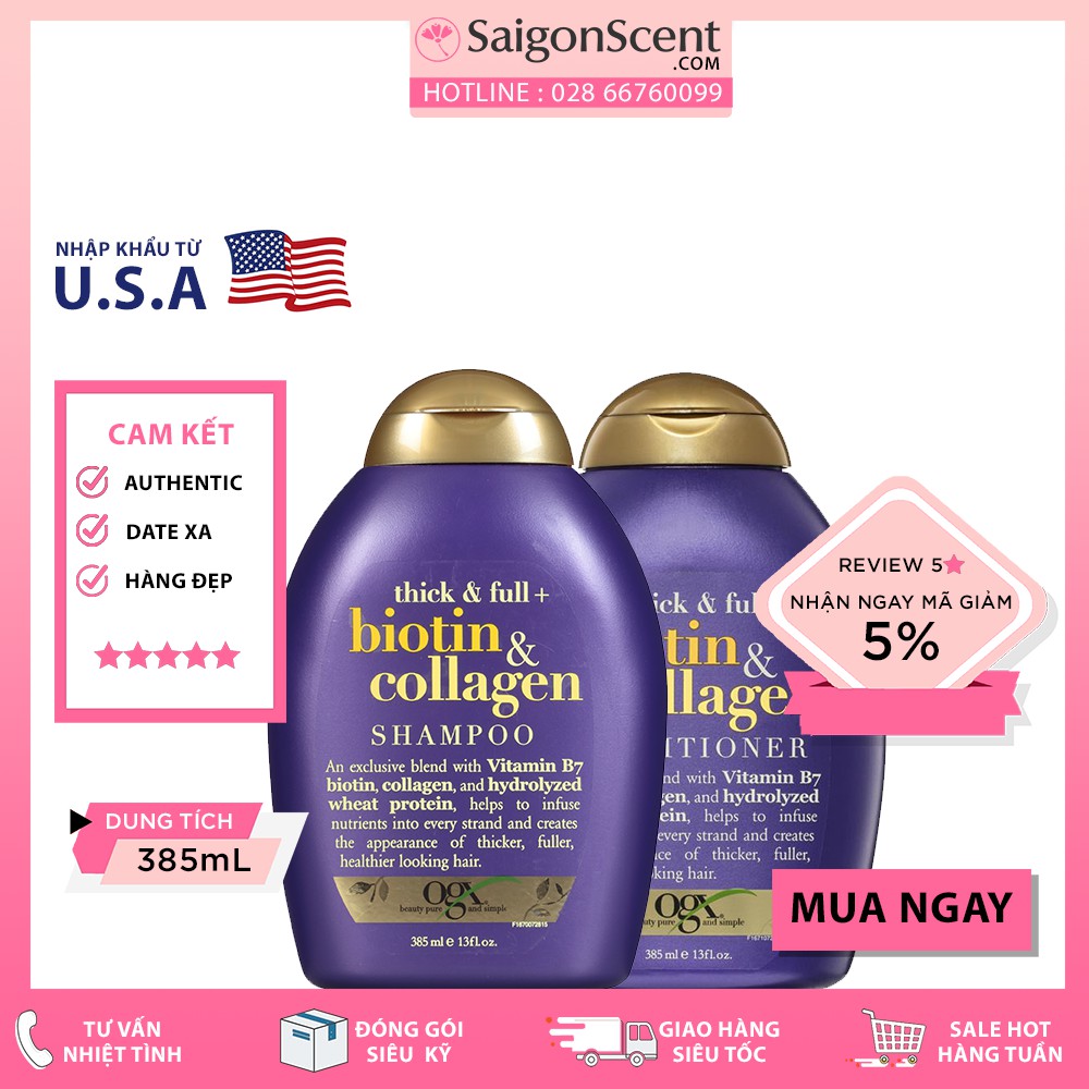 Dầu gội Ogx Biotin &Collagen bổ sung Collagen và Biotin cho tóc, giúp tóc mềm mượt và bồng bềnh. Hỗ trợ chống rụng tóc và phục hồi sức khoẻ cho tóc. Thích hợp cho bất kỳ loại tóc hay da đầu.