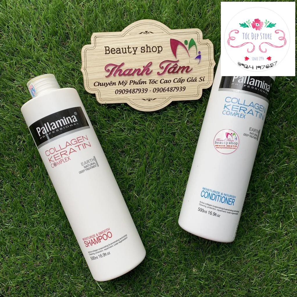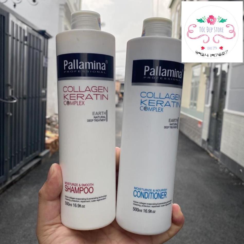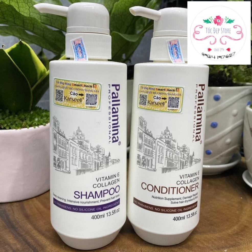 Cặp gội xả phục hồi tóc hư tổn Pallamina Collagen Keratin 400mlx2 Cặp gội xả Pallamina Professional hoàn toàn thành phần tự nhiên làm mềm và thư giản cho tóc, tạo cho mái tóc nhẹ nhàng và khỏe mạnh trong thời gian ngắn. Bộ gội xả sự kết hợp hiệu suất cao của provitamin mạnh B7 biotin truyền chất dinh dưỡng vào mỗi sợi tóc, collagen giúp tóc dày và tăng kích thước, protein lúa mì thủy phân tăng cường làm cho tóc dày và khỏe để giải quyết vấn đề phục hồi tóc là như thế nào Dầu xả Pallamina collagen conditioner giàu protein thực vật có chứa các axit amin: Collagen, keratin methionine cũng như nguyên tố vi lượng, nó bổ sung dinh dưỡng cho tóc. Thủy phân collagen thấm sâu vào tóc và giải quyết các vấn đề về tóc giúp tóc chắc khỏe bồng bềnh Cặp gội xả Pallamina Collagen Keratin Complex 500ml – Dung tích: 400ml + 400ml – Hạn sử dụng: 3 năm