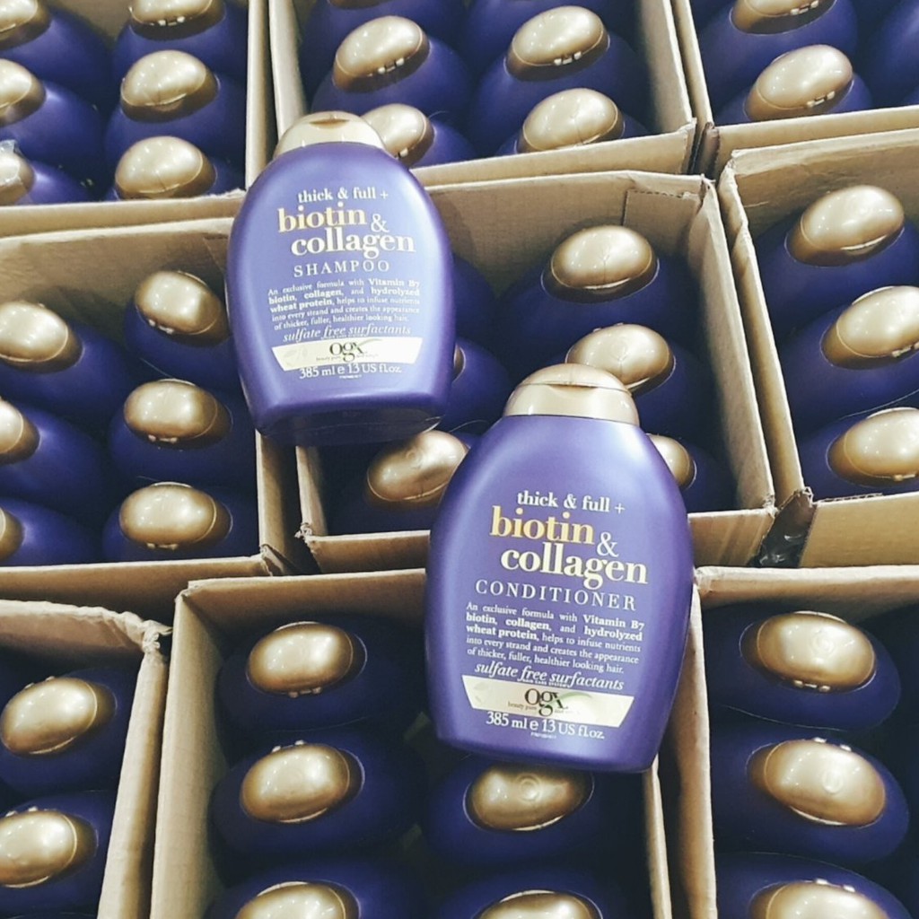 DẦU GỘI BIOTIN&COLLAGEN THICK&FULL chống rụng tóc, kích thích mọc tóc 👉 Hiệu quả cực kì! Mẹ nào mới sinh xong nhớ thủ 1 em trong nhà nha. Mùi rất Tây luôn 💕 ĐỘI NÀO TÓC THƯA - TÓC MỎNG - TÓC KHÔ-XƠ XÁC- DỄ GÃY- RỤNG NHIỀU VỀ NGAY NHÀ EM NHÉ 🍃🍃Dầu gội chăm sóc tóc OGX Biotin & Collagen phù hợp với những ai ? 🔹Những Mom có tóc yếu gãy rụng trước và sau khi sinh. 🔹Những người tóc yếu, giòn, dễ đứt gãy do thiếu chất 🔹Da đầu thường xuất hiện bã nhờn, tóc kém độ bồng bềnh. 🔹Những ai dị ứng với thành phần hóa chất ngành tóc quá nhiều trong sản phẩm gội thông thường. 🔹Không khí ngày càng ô nhiễm khiến cho da đầu bạn nhanh bám bụi bẩn, sử dụng nhiều các loại chất nhuộm tóc, uỗn, duỗi… làm tóc bạn ngày càng hư tổn, xơ rối, gãy rụng. 💕 Dầu gội và xả Biotin Collagen là cách dễ dàng, hiệu quả nhất giúp tóc khỏe mạnh, đầy sức sống. ☘️Tinh chất collagen, ProVitamin B7, biotin và các dưỡng chất giữ ẩm cho tóc ☘️Không chứa chất bảo quản paraben và chất tạo bọt sulfates gây ung thư như các loại dầu gội thông thường. Đạt tiêu chuẩn của cục quản lí Thực phẩm và Dược phẩm ĐỨC 💕TÁC DỤNG CỦA DẦU GỘI VÀ XẢ THICK & FULL BIOTIN COLLAGEN 👍Giảm thiểu quá trình tiết bã nhờn ở chân tóc 👍Giúp phục hồi tóc yếu và gãy rụng 👍Cung cấp dưỡng chất Vitamin B7 Biotin và Collagen giúp tóc dày và mượt hơn 👍Hương thơm dịu nhẹ, tươi mát mang lại cảm giác thư giãn. 👍Kích thích mọc tóc con giúp tóc dày lên và chắc khỏe. 🌿100% Organic là thực phẩm hữu cơ được chiết xuất hoàn toàn từ thảo dược thiên nhiên, không chứa một tí chất thêm nào. 🌿Chất Collagen có tác dụng làm kích thích mọc tóc, các protein được thủy phân từ lúa mì giúp tóc ngày càng khỏe mạnh, đầy hơn và tràn đầy sức sống. 🌿Bổ sung độ ẩm, tăng sự đàn hồi, dẻo dai của sợi tóc 🌿Ngăn ngừa lão hóa của tóc. Giúp sợi tóc khỏe, sáng bóng mượt hơn nhiều lần. 🌿Bổ sung axit amin, khoáng chất cần thiết cho tóc để giúp tóc bóng mượt và ngăn gãy rụng. 🌿Lưu giữ hương thơm lâu- Mùi thơm rất Tây.