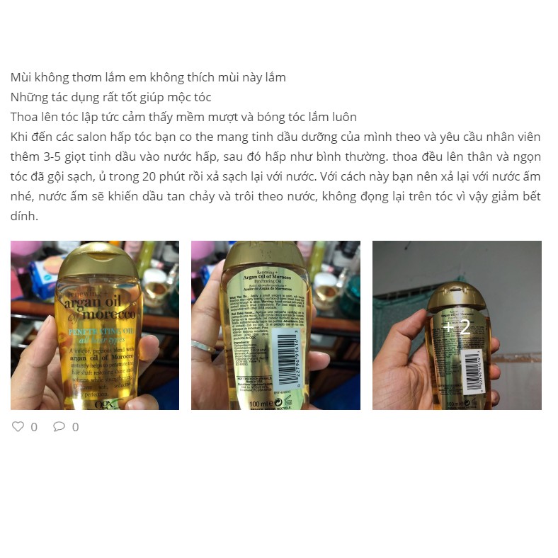 👉👉Công dụng: Dưỡng ẩm cho tóc một cách tự nhiên và hiệu quả. Dầu Argan thâm nhập vào các nang tóc, cung cấp Vitamin E và dưỡng chất cần thiết giúp tóc chắc khỏe, bóng mượt, phục hồi tóc xơ & hư tổn, giảm chẻ ngọn & gãy rụng. Tái tạo cấu trúc sợi tóc từ bên trong giúp tăng sự đàn hồi cho tóc Bổ sung biotin & collagen cho tóc dày, khỏe mạnh Hương thơm nhẹ nhàng mang lại cảm giác thoải mái, dễ chịu. 👉👉 Cách sử dụng: Sau khi gội đầu nên để tóc khô tự nhiên, khi gần khô thì dùng 1 lượng nhỏ dầu (2-3 giọt) xoa vào tóc. Nếu nhiều quá sẽ tạo độ dư không hấp thụ hết được, gây bết tóc. Nếu da đầu bạn thuộc loại dầu thì chỉ nên bôi phần thân tóc & tránh xa da đầu. Sau đó hoàn thiện kiều tóc như ý (sấy, tạo kiểu) Nên sử dụng thường xuyên để trị tóc hư tổn, chẻ ngọn, dễ giòn gãy