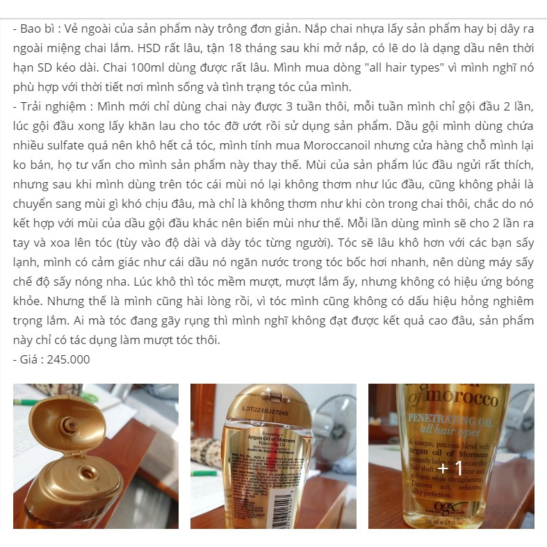 Sản phẩm Dầu Dưỡng Tóc Ogx Moroccan Oil nhận được 1 lượt đánh giá tích cực từ những người mua khác. Bấm vào nút Xem Đánh Giá để chuyển sang phần đánh giá của người dùng đã mua hàng.