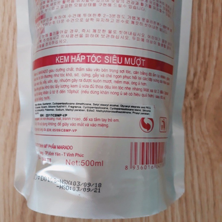Sỉ số lượng liên hệ 0949503649 dung tích : 500 ml quy cách : dạng túi sản xuất : Công ty TNHH mỹ phẩm Marado, KCN Khai Quang, Tỉnh Vĩnh Phúc, Việt Nam hạn sử dụng : 3 năm Số đăng kí : 22/17/CBMP - VP dầu ủ tóc Marado được sản xuất trên dây chuyền công nghệ hiện đại của Nhật , giàu dưỡng chất giúp nuôi dưỡng mái tóc sâu từ bên trong, giúp tóc luôn suôn mượt, bóng khỏe , giảm gãy rụng, hết chẻ ngọn hiệu quả mà chi phí lại rất tiết kiệm vì sản phẩm được đóng gói dạng túi tiết kiệm bao bì nhiều hơn so với đóng gói dạng hộp 1.THÀNH PHẦN : water, sillicone, quartamin, cyclopentasiloxane dimethicone , setyl strearyl alcohol, glyceryl stearate & PEG 100 stearate , glycerin, sillicone fluid 1411, fragrance, cyclopentasiloxane, cyclopentasiloxane blend, sillicone fluid, hydroxyethyl , polawwax, sodium, methyl paraben, Edta2, methylchloroithiazolione, propyl paraben 2. CÔNG DỤNG ĐẶC BIỆT : - dầu ủ tóc Marado chứa nhiều dưỡng chất thấm sâu vào tận bên trong từng sợi tóc, cân bằng độ ẩm tự nhiên giúp các sợi tóc bị tổn thương như tóc khô, xơ, cứng, gẫy , chẻ ngọn ... phục hồi các lớp sừng do hậu quả của việc tẩy, sấy, uốn, ép , nhuộm gây ra giúp tóc luôn được suôn mượt, mềm mại, chắc khỏe và óng ả 3. HƯỚNG DẪN CÁCH SỬ DỤNG : - khi dùng dầu gội gội sạch tóc, dùng một lượng dầu ủ tóc Marado vừa đủ ra lòng bàn tay rồi thoa đều lên tóc, matxxa nhẹ nhàng cho dầu ủ thấm đều vào tóc. Đợi 5 - 10 phút thì bạn xả sạch nước ấm nhẹ cho sạch tóc, dùng khăn bông mềm thấm khô tóc và để tóc khô tự nhiên, hạn chế sấy tóc , nếu dùng khăn nóng ủ tóc thì tóc sẽ mềm mại hơn rất nhiều 4. BẢO QUẢN : để kem hấp tóc Marado ở nơi thoáng mát, tránh nhiệt độ cao, tránh xa tầm tay của trẻ em #kemu-haptoc #dauutoc #kemhaptocmarado