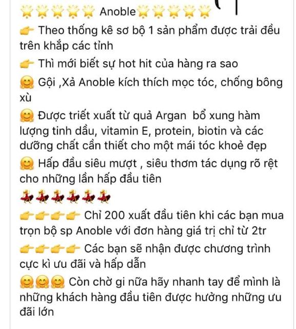 💣SẢN PHẨM SIÊU HOT CHO NHỮNG NGÀY ĐẦU NĂM! 👉COMBO Anoble ArganOil Morocco HÀNG CHUẨN CÔNG TY!👈 🌟🌟🌟🌟🌟 Anoble🌟🌟🌟🌟🌟 👉 Theo thống kê sơ bộ 1 sản phẩm được trải đều trên khắp các tỉnh 👉 Thì mới biết sự hot hit của hàng ra sao 🤗 Gội ,Xả Anoble kích thích mọc tóc, chống bông xù 🤗 Được triết xuất từ quả Argan bổ xung hàm lượng tinh dầu, vitamin E, protein, biotin và các dưỡng chất cần thiết cho một mái tóc khoẻ đẹp 🤗 Hấp đầu siêu mượt , siêu thơm tác dụng rõ rệt cho những lần hấp đầu tiên 💃💃💃💃💃💃 👉👉👉👉 Các bạn sẽ nhận được chương trình cực kì ưu đãi và hấp dẫn 🤗🤗🤗 Còn chờ gi nữa hãy nhanh tay để mình là những khách hàng đầu tiên được hưởng những ưu đãi lớn -------------------------- -------------------------- ✅Gội xả, Tinh dầu, Hấp ủ hợp với mọi loại tóc! ✅Mùi thơm nhẹ nhàng và giữ cực lâu ✅Siêu mềm mượt, Siêu phục hồi