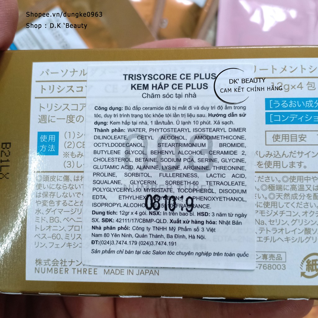 Kem Hấp Phục Hồi Tóc TRISYSCORE CE PLUS 12gr (Number Three 003) Công Dụng : Bù đắp Ceramide đã bị mất và duy trì độ ẩm trong tóc, duy trì tình trạng tóc khỏe tới lần trị liệu sau. Hướng Dẫn Sử Dụng : Kem hấp tại nhà dùng 1 tuần/1 lần, ủ lạnh 10 phút rồi xả sạch. ======================================================= 👉Kem Hấp Tăng Cường Bóng Mượt CP Pack 12gr (Number Three 003) Công Dụng : Tăng Cường độ bóng mượt cho tóc Hướng Dẫn Sử Dụng : Kem hấp tại nhà dùng 1 tuần/1 lần, ủ lạnh 10 phút rồi xả sạch. #003 #NumberThree003 #kemhấptrisyscoreceplus #kemhấptrisyscore #kemhấp003 ##kemhấpNumberThree #hấplạnhNumberThree #hấplạnhtrisyscore #hấpphụchồiNumberThree #hấpphụchồi003 #hấpphụchồitrisyscore