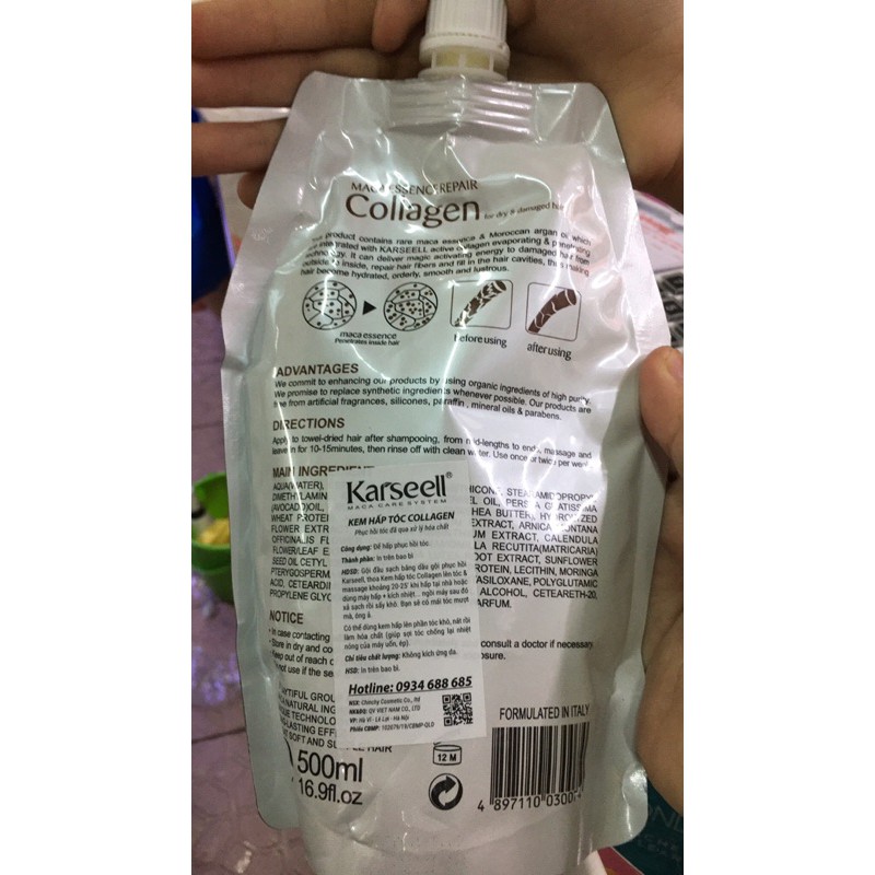 HẤP PHỤC HỒI COLLAGEN KARSEELL SIÊU MỀM MƯỢT TÓC ( chính hãng). Giá cực tốt. Dung tích 500 ml. Xuất xứ : Ý Hấp phục hồi Collagen Karseell được khách hàng ưa chuộng bởi chất lượng và mùi hương ngây ngất, bên cạnh đó giá cả hợp lý nên đây là 1 trong những sản phẩm hấp dầu hot nhất hiện nay. Có thể ủ nóng hoặc lạnh từ 15-30ph , tóc bạn sẽ cải thiện đáng ngạc nhiên. Nay có thêm dạng hũ cho quý khách lựa chọn. Hãy sử dụng sản phẩm chính hãng công ty để cảm nhận chất lượng sản phẩm nhé.