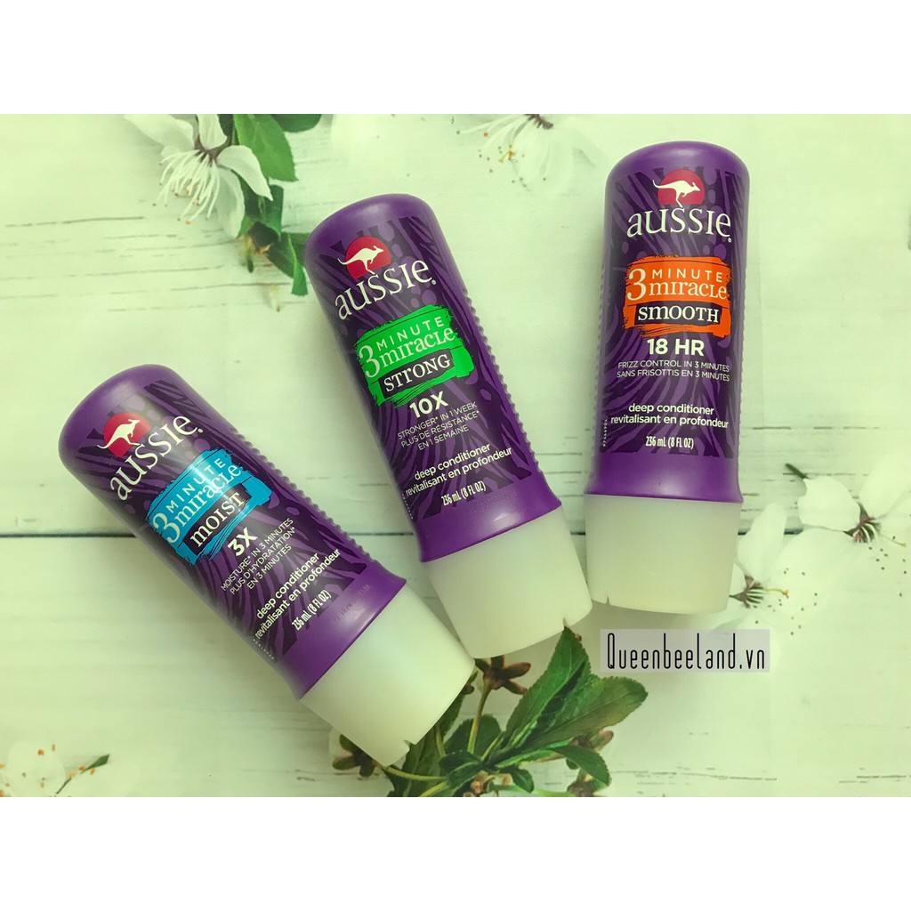 MADE IN USA DUNG TÍCH: 236ml (8oz) 1. AUSSIE 3 MINUTE MIRACLE MOIST - Nuôi dưỡng tóc mềm mượt như lụa - Hồi phục mái tóc hư tổn chỉ trong 3 phút - Mùi cam, bưởi và chanh 2. AUSSIE 3 MINUTE MIRACLE STRONG - Giúp tóc chắc khỏe - Giảm gãy rụng và hư tổn - Mùi cam quýt, hương hoa và gỗ 3. AUSSIE 3 MINUTE MIRACLE SMOOTH - "frizz-control" giúp tóc khỏi bị quện lại thành từng lọn và dưỡng tóc thẳng mượt không bị xoăn