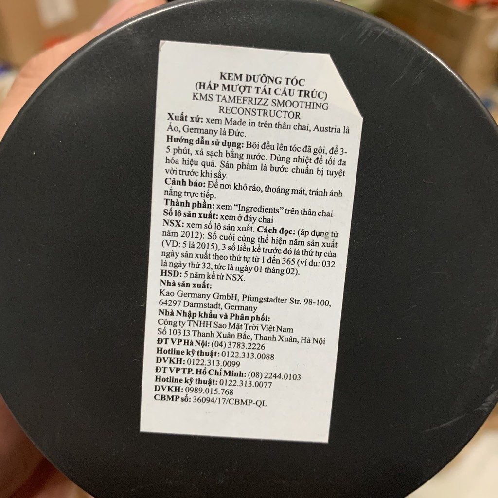 KEM DƯỠNG TÓC (HẤP MƯỢT TÁI TẠO CẤU TRÚC ) KMS TAMEFRIZZ SMOOTHING RECONSTRUCTOR 200ML Được thành lập vào năm 1976 tại California (Mỹ), và gia nhập tập đoàn Kao (Nhật Bản) từ năm 2002, KMS đã có hơn 40 năm kinh nghiệm trong lĩnh vực chăm sóc tóc chuyên nghiệp. Nền tảng của thương hiệu KMS là công nghệ chính độc quyền độc đáo, và tiên phong về phong cách, lấy cảm hứng từ các trung tâm thời trang khắp toàn cầu. Với kem dưỡng tóc này bạn sẽ cảm nhận được sự mềm mượt và tươi trẻ của mái tóc mình. Cách dùng: Bôi đều lên tóc đã gội, để 3-5 phút ,xả sạch bằng nước. Dùng nhiệt để tối đa hóa hiệu quả. Sản phẩm là sự chuẩn bị tuyệt vời trước khi sấy . Nhà nhập khẩu và phân phối : Công ty TNHH Sao Mặt Trời Việt Nam