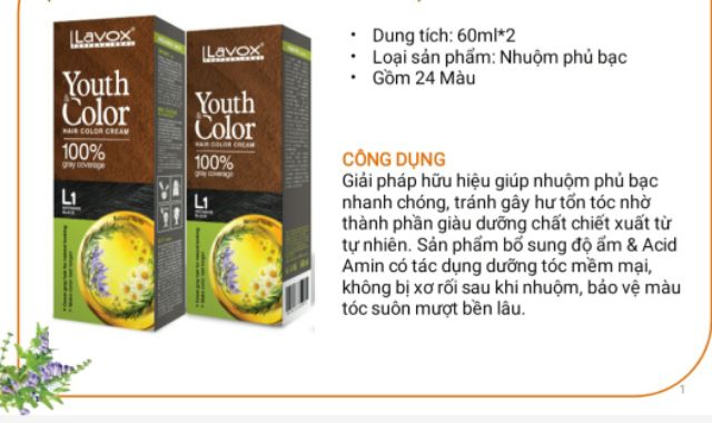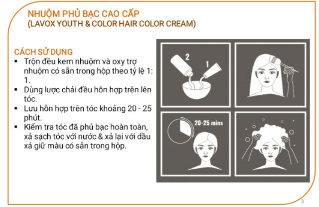 CÔNG DỤNG Giải pháp hữu hiệu giúp nhuộm phủ bạc nhanh chóng, tránh gây hư tổn tóc nhờ thành phần giàu dưỡng chất chiết xuất từ tự nhiên. Sản phẩm bổ sung độ ẩm & Acid Amin có tác dụng dưỡng tóc mềm mại, không bị xơ rối sau khi nhuộm, bảo vệ màu tóc suôn mượt bền lâu. HƯỚNG DẪN SỬ DỤNG Trộn đều kem nhuộm và oxy trợ nhuộm có sẵn trong hộp theo tỷ lệ 1:1. Dùng lược chải đều hỗn hợp trên lên tóc. Lưu hỗn hợp trên tóc khoảng 20 – 25 phút. Kiểm tra tóc đã phủ bạc hoàn toàn, xả sạch tóc với nước & xả lại với dầu xả giữ màu có sẵn trong hộp.