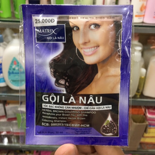1 gói Gội là nâu Matrix 30ml * Tóc bạc không cần nhuộm chỉ cần gội là nâu * Thể tích thực: 30ml * SCB: 000203/19/CBMP-HCM * Sản phẩm chất lượng cao của: công ty TNHH SX TM DV Contra. Địa chỉ: Gò Vấp, HCM.