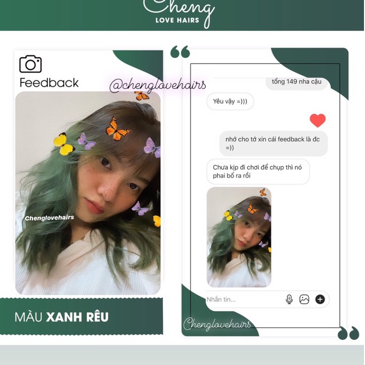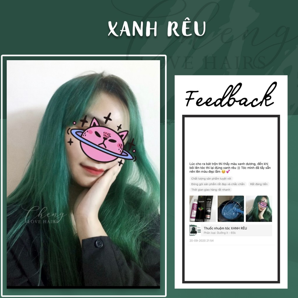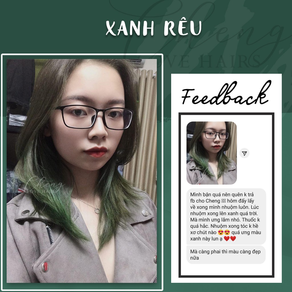 Theo thống kê từ hệ thống của MLEMBEAUTY, sản phẩm Thuốc Nhuộm Tóc Xanh Rêu có hơn 3491 lượt xem trong tháng này và có hơn 372 lượt mua toàn thời gian cùng với 111 đánh giá tích cực với điểm đánh giá sao trung bình là ⭐⭐⭐⭐⭐ (5 sao). Bạn hãy yên tâm mua sản phẩm này nhé!