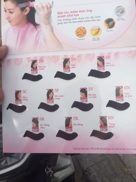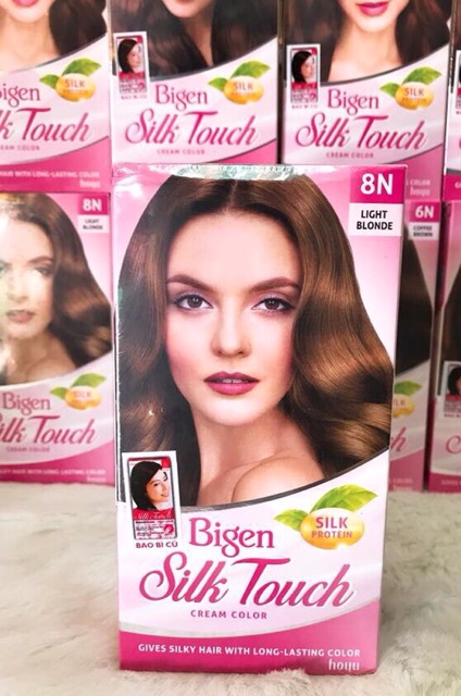Đặc điểm sản phẩm: Có thành phần chứa chiết xuất từ 6 dưỡng chất thảo dược, vì thế Bigen an toàn, luôn mang lại cho tóc vẻ mềm mại, ngăn ngừa tình trạng khô xơ,gãy rụng, chăm sóc tóc hiệu quả. Bigen Silk Touch có thời gian phủ bạc hoàn hảo .Thuốc nhuộm tóc Bigen là một trong những bí quyết làm đẹp của phụ nữ. Thuốc nhuộm tóc Bigen có 7 ưu điểm vượt trội hơn các loại thuốc khác: Màu sắc tự nhiên, tóc mềm và khoẻ, màu đồng nhất, bền màu, tiết kiệm, thời gian nhuộm nhanh, tự nhuộm dễ dàng. Hướng dẫn sử dụng: Đeo bao tay có sẵn trong hộp. Cho lọ dung dịch vào bình nhựa, lắc nhẹ và đều tay cho đến khi cảm thấy bình căng. Nhấn nắp bình nhựa rồi lấy bọt màu xoa đều lên tóc (từ chân tới ngọn). Khi thấy bình vơi bọt, tiếp tục lắc nhẹ để tạo bọt tiếp. Để từ 25 - 30 phút ( tuỳ tóc khỏe hay yếu). Tóc khỏe để thời gian lâu hơn tóc yếu 5 phút. Xả sạch lại với nước ấm. Tiếp tục gội đầu bằng gói dầu xả có trong hộp. Bôi dầu xả lên tóc và để trong 10 phút rồi xả sạch. 2N - màu đen tự nhiên 3N - màu nâu đen 5B - nâu socola 5C - nâu đồng 5P - đỏ rượu vang 5V - đỏ tím violet 6N - nâu cafe 6R - đỏ đồng đậm 8N - vàng nhạt