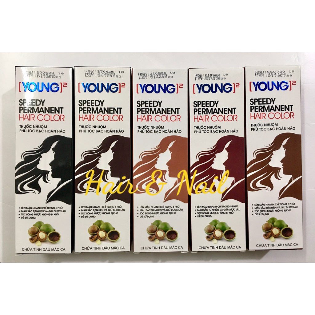 THUỐC NHUỘM PHỦ TÓC BẠC HOÀN HẢO YOUNG trọng lượng : 60 g x 2 quy cách : 1 tuýp thuốc nhuộm , 1 lọ trợ oxy, 1 găng tay nilon Sản phẩm của công ty mỹ phẩm DPT Cosmetics, Việt Nam. Thuốc nhuộm tóc Young dễ sử dụng , phủ bạc hoàn hảo, lên màu nhanh chỉ trong 5 phút, màu sắc tự nhiên và giữ được lâu, tóc bóng mượt mà không bị khô, không bị kích ứng da đầu, có nhiều màu sắc để lựa chọn, giá thành hợp lý 1. THÀNH PHẦN : xem trên bao bì 2.CÔNG DỤNG : - LÊN MÀU NHANH CHÓNG CHỈ TRONG 5 P - MÀU SẮC TỰ NHIÊN VÀ GIỮ ĐƯỢC LÂU - TÓC BÓNG MƯỢT , KHÔNG BỊ KHÔ - DỄ SỬ DỤNG 3. CÁCH SỬ DỤNG : - gội sạch tóc và lau khô tóc , lưu ý không cào mạnh vào da đầu - dùng chén nhựa pha kem nhuộm ( Color cream ) và kem trợ nhuộm ( Developer ) theo tỉ lệ 1 : 1 ( số lượng vừa đủ nhuộm ) . Đóng nắp kĩ bảo quản phần còn lại để sử dụng tiếp lần sau - trộn đều hỗn hợp, mang găng tay và bôi kem đều lên tóc từ chân ra ngọn - đợi trong vòng 5-20 phút tùy theo nhu cầu đậm nhạt - khi màu lên đúng theo ý muốn, xả tóc lại thật sạch - sau khi nhuộm phủ bạc được một thời gian, phần chân tóc sẽ mọc lên 1-2 cm, nếu muốn nhuộm lại phần chân tóc này ta chỉ cần thực hiện bước thứ 2 là được 4. BẢNG MÀU : thuốc nhuộm tóc Young có 6 tông cơ bản quý khách nên để chọn phân loại màu hoặc để lại ghi chú để shop giao màu đúng nhé - tông 201 : đen tự nhiên - tông 202: nâu tự nhiên - tông 203 : màu nâu đồng - tông 204 : màu nâu đỏ. - tông 205 : màu nâu hạt dẻ. - tông 206 : màu nâu hồ đào ( đang hết hàng