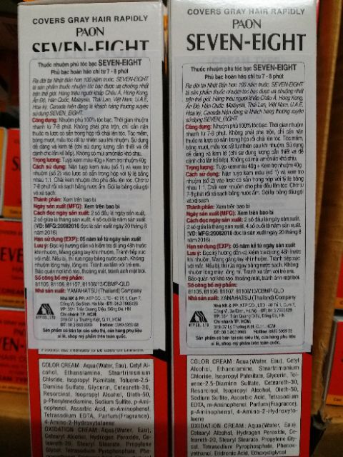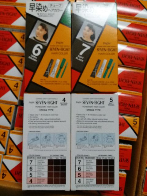 Thuốc nhuộm tóc SEVEN-EIGHT là dòng thuốc nhuộm chuyên phủ bạc, gồm có 4 tông màu từ đậm đến nhạt. Tông số 7 : màu đen tự nhiên Tông số 6 : màu nâu đậm ( nâu đen) Tông số 5 : màu nâu vừa Tông số 4 : màu nâu tự nhiên Một hộp nhuộm có 2 típ kem , 1 cây lược chải nhuộm và 1 bàn chải.