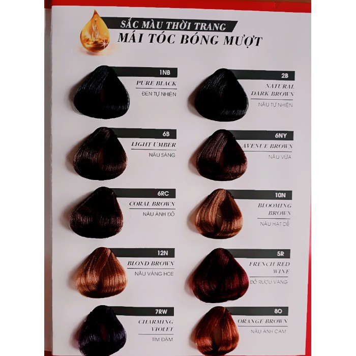 Tính năng & Ưu điểm sản phẩm Bước 1: Thoa đều Pre-nutritive Essence lên toàn bộ mái tóc, tập trung các vùng tóc bị xơ yếu • Massage nhẹ nhàng trong 5’ cho Essence thấm đều Bước 2: Mang bao tay, nặn tuýp số 1 vào chai số 2 • Vặn nắp chặt & lắc kỹ để hỗn hợp được trộn đều Bước 3: Nhuộm từ sau gáy – 2 bên tai – 2 bên thái dương – Trước trán – Giữa trán • Dùng tay massage để thuốc thấm đều trong 30’ • Xả sạch lại với nước • Thoa đều After Nutritive Treatment lên tóc, massage trong 3-5’. Xả sạch lại với nước, • Không gội đầu lại trong vòng 02 ngày, sau khi nhuộm Với công thức cải tiến từ Viện Nghiên cứu thuộc tập đoàn LG Household & Health Care – Hàn Quốc. – Sử dụng các màu sắc tự nhiên và dưỡng chất chăm sóc tóc giúp tóc mềm mượt & bền màu sau khi nhuộm. – Có 2 cách lựa chọn: • Sắc màu thời trang: + 6B – Nâu ánh đồng tư nhiên + 6NY – Nâu ánh kim thanh lịch + 10N – Nâu hạt dẻ dịu dàng + 12N – Nâu ánh vàng rực rỡ. • Sắc màu tự nhiên (dùng phủ tóc bạc ): + 1NB – Đen tự nhiên + 2B – Nâu tự nhiên