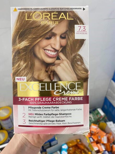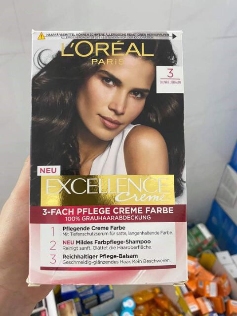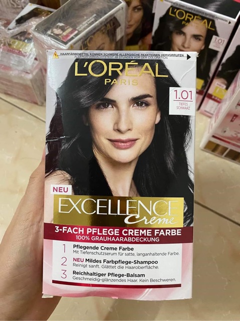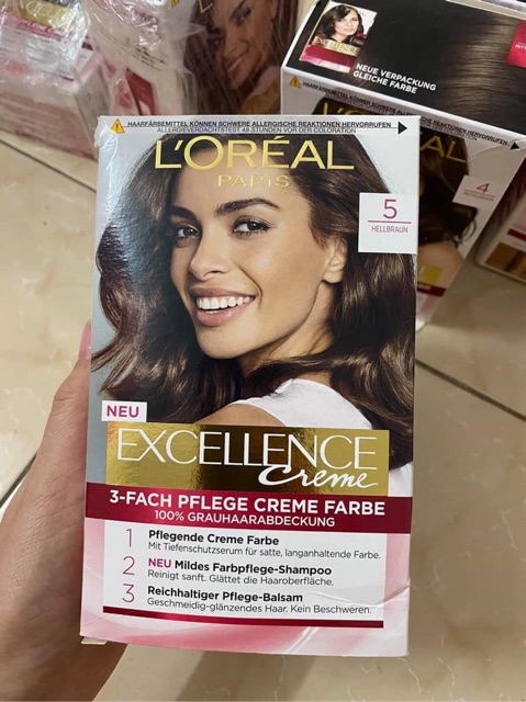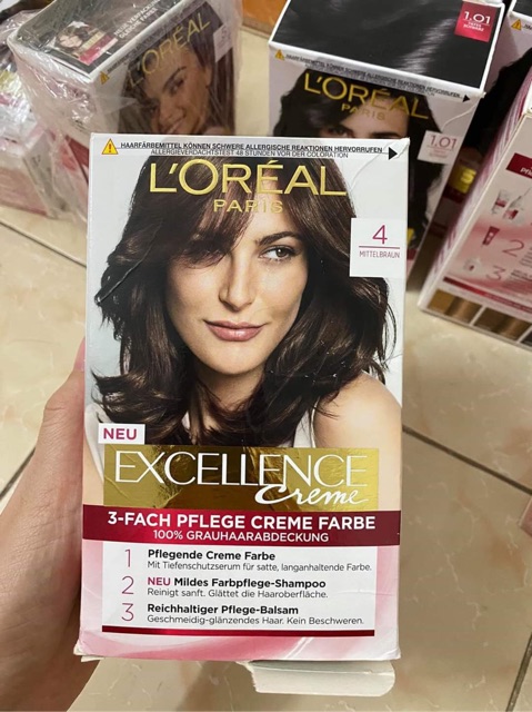 ThUỐC NHUỘM TÓC L’OREAL PARIS dòng EXCELLENCE CREME Xuất xứ : Pháp Xuất Đức Giá : 250K Đôi điều về dòng sản phẩm nhuộm tóc Loreal excellence -> Excellence Creme là một trong những thương hiệu nổi tiếng của Loreal Coloration. -> Đặc điểm nổi bật của Creme là dạng kem bọt, có chứa PROTEIN giúp tăng cường chất sừng của tóc, nuôi dưỡng và bảo vệ cả bên trong lẫn bên ngoài tóc, -> COLLAGEN giúp trẻ hóa mái tóc của bạn là cuối cùng là cơ cấu CERAMID giúp tăng cường bảo vệ và làm mềm tóc. => 3 yếu tố này chính là nguyên nhân vì sao sau khi nhuộm xong mà tóc bạn ko hề bị khô mà luôn bóng mượt MỘT HỘP BAO GỒM: + 1 tuýp bảo vệ tóc trước khi nhuộm + 1 lọ dung dịch + 1 tuýp gel màu + 1 gói ủ xả + 1 tờ hướng dẫn sử dụng + 1 đôi găng tay. + 1 đầu răng lược để tiện cho các bạn tự nhuộm ở nhà - CÁCH SỬ DỤNG: + Dùng tuýp bảo vệ, bôi lên ngọn tóc, chân tóc, những phần tóc yếu. Để nguyên ko cần xả và bắt đầu nhuộm + Cho thuốc nhuộm vào lọ dung dịch, lắc đều. + Đeo găng tay và Bôi đều lên tóc làm từng lọn tóc 1 + Chờ khoảng tầm 30' , kiểm tra xem màu đã lên chưa + Xả xạch với nước và dầu xả . Mùi thơm rất dễ chịu ko có cảm giác khó chịu của thuốc nhuộm. SHOP SẴN CÁC MÀU: - Số 1 : đen dùng phủ bạc - Số 4: Nâu trung tính (ko tối ko sáng) : Mittelbraun - Số 5: nâu sáng Hellbraun - Số 7: Nâu tơ nhẹ hay còn gọi là vàng trung tính (ko tối ko sáng quá) Mittelblond