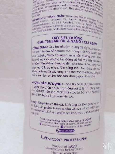 CÔNG DỤNG Rất nhiều người muốn đổi màu hoặc làm tóc highlight nhưng lại lo lắng về hóa chất trong kem nhuộm. Công nghệ nâng tông màu chuyên nghiệp của LAVOX HYDROGEN PEROXIDE giúp quá trình nhuộm tóc đạt hiệu quả hơn với sự tăng cường hàm lượng dưỡng chất bảo vệ tóc khỏi tác động có hại của kem nhuộm, đồng thời làm tóc mềm mại hơn, bóng mượt hơn, rực rỡ hơn. Sản phẩm độc đáo không gây rát da đầu. HƯỚNG DẪN SỬ DỤNG Trộn với kem nhuộm tóc hay bột tẩy tóc theo tỉ lệ 1:1, xoa đều lên tóc, lưu trên tóc với thời gian thích hợp, sau đó xả sạch.
