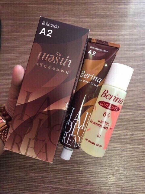 Cách sử dụng thuốc nhuộm tóc Berina A2 Thái Lan: Bước 1: Bạn cần chăm sóc tóc trước khi nhuộm - Dưỡng tóc + Hầu hết các loại thuốc nhuộm đều có những thành phần hoá học có thể làm tóc khô. Vì vậy, trước khi nhuộm, bạn cần có kế hoạch chăm sóc đặc biệt cho tóc như: ủ tóc, dùng dầu gội dưỡng ẩm và phục hồi… Đặc biệt, tránh duỗi, uốn, làm xoăn… ít nhất 1 tuần trước đó. - Không gian tiến hành nhuộm nên ở những nơi như phòng tắm là hợp lý. + Dùng găng tay nilon khi tiến hành nhuộm + Mặc một chiếc áo cũ và chuẩn bị một chiếc lược cũ Bước 2: Thao tác nhuộm - 1. Đọc kĩ chỉ dẫn khi sủ dụng thuốc nhuộm tóc Berina A2 - Bạn nhớ làm theo các bước nhuộm + Chuẩn bị màu nhuộm (pha thuốc theo tỉ lệ 1:1 đã chỉ định) + Chia tóc ra thành từng lớp mỏng và cố định bằng cặp mỏ vịt. Chia lớp tóc nào, bôi ngay thuốc nhuộm lên lớp tóc đó. + Bôi thuốc lần lượt lên thân tóc, đuôi tóc rồi mới đến chân tóc do chân tóc bắt màu nhanh hơn các vùng khác. + Đừng ngại dùng đầu ngón tay để miết thuốc đều lên tóc + Sau khi trải thuốc đều lên tóc, để một lúc theo thời gian chỉ định (thường là 30-45 phút). + Sau đó, gội đầu dưới vòi nước ấm và xả mạnh cho đến khi thấy nước trong mới dừng.