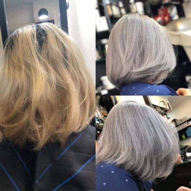 Set này phù hợp cho những bạn tóc ngắn, tóc ngang vai, nhuộm omber hay móc lai Set này giúp bạn có 1 nền tóc sáng từ lever 10 trở lên, thoả sức nhuộm màu thời trang bất kì và cả màu bạch kim khó nhằn. Gồm: - 2 hộp bleach xanh - 100ml khử vàng elgon tách lẻ Lưu ý: - Các bạn tóc khoẻ hay chỉ nhuộm omber, móc lai nên dùng còn các bạn tóc yếu nên thay bột tẩy bằng nâng tone galati để giảm thiểu hư tổn nhé! Cách dùng: Tẩy lần 1: B1. 1 hộp tẩy gồm 2 gói tẩy và 1 chai dung dịch, bạn trộn đều lại, đeo găng tay và nhuộm lên phần tóc cần nhuộm, lưu giữ thuốc ko quá 30p. B2. Gạt lớp thuốc trên tóc, tiếp tục trộn hộp tẩy còn lại cho đều và bôi lên tóc 25p nữa. B3. Gội sạch bằng dầu gội ( tốt nhất là clear). Sau đó dùng tầm 2-3 nắp khử vàng pha với dầu gội thường rồi massage thêm ko quá 10p. Xả sạch. Để khô tóc. Bạn muốn nhuộm màu gì cũng được. * Mẹo nhỏ: - Nếu tẩy sát da đầu bạn nên bôi 1 lớp vaseline vào da đầu để khi bôi tẩy tóc da dù nhạy cảm cách mấy cũng ko bị ảnh hưởng, tê ngứa vì đã có lớp vaseline bảo vệ da đầu. - Muốn chải thuốc tẩy lên tóc trơn và dễ hơn thì nên thêm vào 1 thìa nhỏ dầu ăn, dầu oliu hoặc dầu dừa. - Tẩy tóc càng sáng thì màu tóc sau khi gội khử vàng sẽ càng trong. Tóc có thể chuyển sang xám, trắng đục hay bạch kim tùy vào mức độ tẩy tóc của bạn.