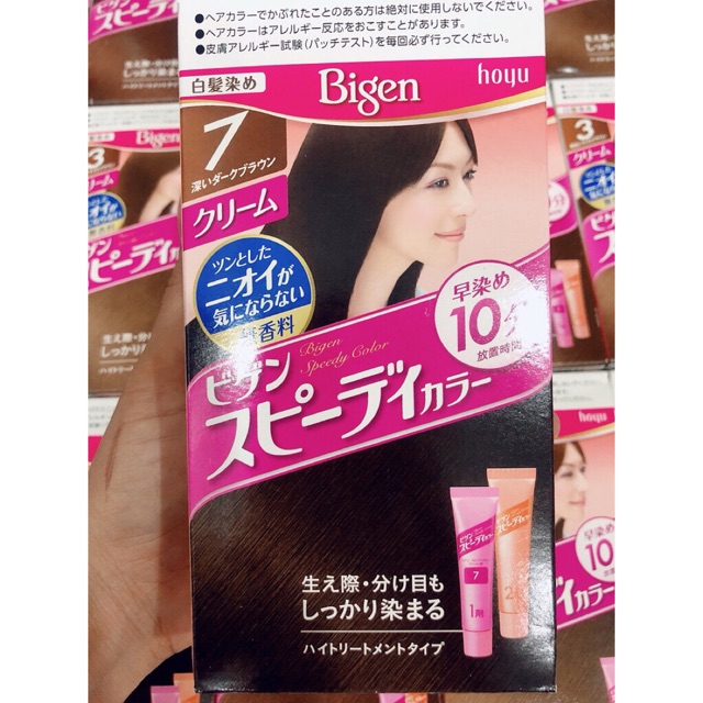 Thuốc nhuộm tóc Bigen của Nhật là sản phẩm 100% thành phần thiên nhiên nên rất an toàn với da đầu& tóc. Thuốc nhuộm tóc Nhật Bản dạng bọt Bigen gồm 1 tuýp thuốc nhuộm được đánh số 1, và dung dịch sữa lỏng được đánh số 2 (đựng trong bình kèm chổi phun như hình minh hoạ) 1 đôi găng tay sử dụng khi nhuộm tóc Tờ HDSD minh hoạ bằng hình ảnh (tiếng Nhật). Trước khi nhuộm bạn cần lưu ý Trước khi sấy thì gội đầu nhẹ rồi dùng máy sấy để sấy khô tóc. Trước khi nhuộm lưu ý bỏ hết các thứ dễ bị nhuộm màu ra.: quần áo, khăn… Không dùng lược răng quá dầy để chải tóc. Kiểm tra da xem có bị dị ứng ko: Hai ngày trước khi nhuộm tóc, bạn làm như sau để kiểm tra xem mình có bị dị ứng với thuốc nhuộm tóc đó hay không 10 bước nhuộm tóc tại nhà với thuốc nhuộm tóc Bigen như sau Chuẩn bị găng tay, kẹp mỏ vịt & nên mặc áo cũ khi nhuộm. Trước khi nhuộm tóc cần bôi thuốc lên da tay xem có bị dị ứng không mới bôi lên tóc. Khi nhuộm tóc cố gắng không để thuốc rơi vào các vùng da. Nếu bị rơi rớt thì dùng khăn giấy lau ngay. Tránh để thuốc nhuộm bị chạm vào da đầu, chân tóc. Tránh bôi thuốc vào vùng da bị tổn thương. Bạn có thể dùng thuốc nhuộm để nhuộm lông mày, nhưng không nên nhuộm lông mi để tránh thuốc vào mắt. Ngay sau khi nhuộm tóc không nên gãi khi gội đầu, có thể sẽ gây rát. Bên trong hộp thuốc nhuộm tóc Bigen có 2 tuýp và 1 bàn chải. Mở vỏ hộp cho các hỗn hợp vào nhau rồi lắc đều trong 10 phút Pha 2 tuýp thuốc nhuộm theo tỉ lệ 1:1 & trộn đều. Chia tóc thành từng lớp mỏng, dùng cọ quết từng lớp thuốc lên tóc sau thật đều. Gội đầu lại sau 30 phút sau khi thoa thuốc lên tóc.