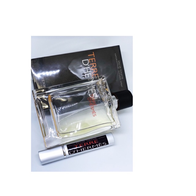 TERRE D'HERMES 230k/10ml ( đã kèm chai sp.lit) 1 huyền thoại và là 1 hương đáng để dùng qua của Hermes Mùi hương đặc trưng: * Lớp hương đầu:cam , bưởi. *Lớp hương giữa:hương tiêu ,cây quỳ thiên trúc. *Lớp hương cuối: hoắc hương , gỗ tuyết tùng , gỗ vertier , nhựa cây. Phong cách: Nam tính , mạnh mẽ , gợi cảm.