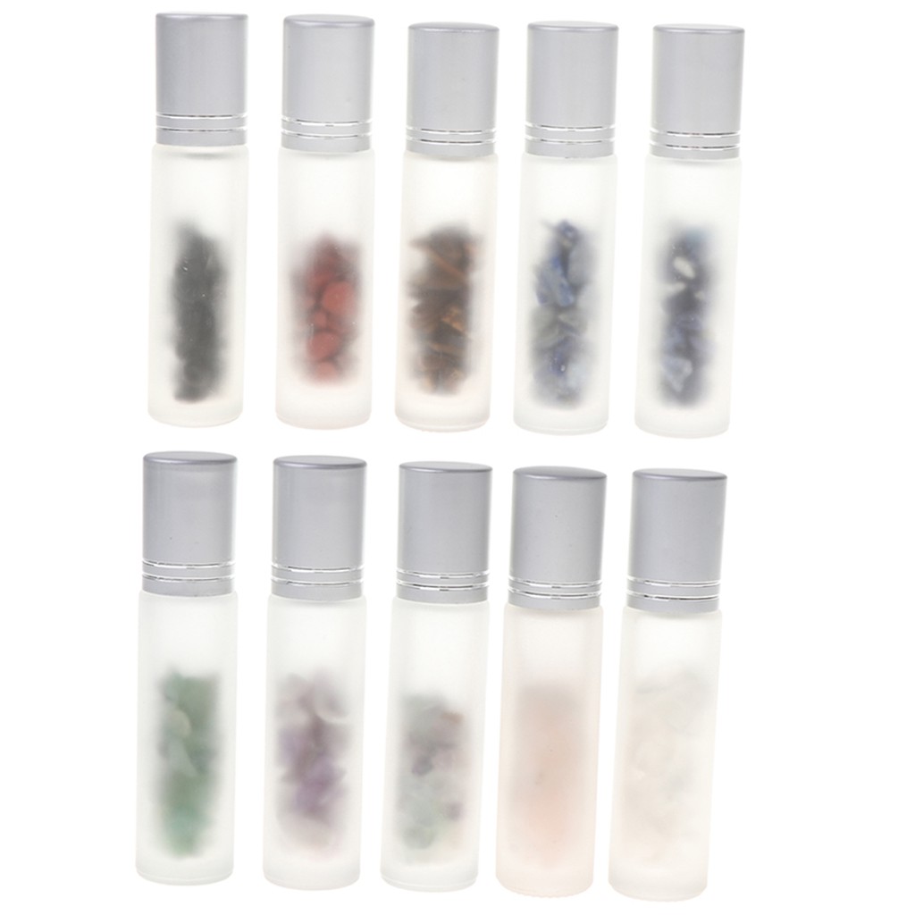 Description: 10 Pcs 10ml Frosted Glass Essential Oil Gemstone Roller Balls Bottles with Stone Chips These bottles allow you to pre-dilute your oil blends so that they can be applied directly to the skin without messy drips or spills. Perfect for use of Essential Oils, Perfumes Oils and Other Liquids. Carry Portable - Take your oils wherever you go with this travel size(10ml) Roller bottles are the most convenient and economical way to dispense essential oil blends. Specification: Material: Glass, Natural Stone Size: Approx. Diameter: 1.9 cm / 0.74 inch Height: 8.5 cm / 3.34 inch Package Includes: 10 Pieces Essential Oil Roller Balls Bottle Note: Suggestion: When you want to use these bottles, you can pour out the mini stones out and wash them with cold water before use. Also you can use the roller bottles as perfume bottle.