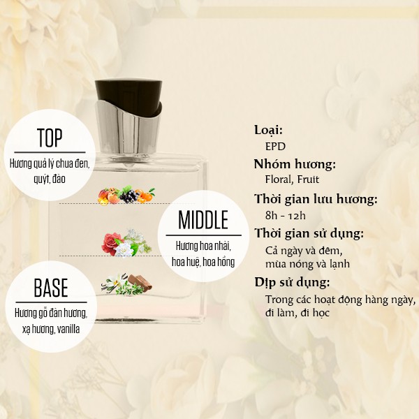 ĐẶC ĐIỂM NỔI BẬT Eau De Parfum Dung tích: 50 ml Thương hiệu: Laura Anne Xuất xứ: Việt Nam Phong cách: trẻ trung, tươi mát. Tầng hương: 3 tầng hương rõ rệt. Độ lưu hương từ 6 - 8 tiếng. Nguyên liệu nhập khẩu hoàn toàn từ Châu Âu. Được sản xuất theo bản quyền của VENUS INC PTE LTD Singapore. .................................................................................................................................................... 1. Nước hoa Laura Anne LITTLE DRESS BLACK LITTLE DRESS - BLACK là một mùi hương cổ điển. Với các thành phần hương có trong nước hoa, bạn có thể nghĩ đây là một mùi hương khá nồng và mạnh, nhưng thực chất, mùi hương lại thiên về phần nhẹ nhàng và có phần sang trọng. Nước hoa mang lại một hương thơm phương đông dễ chịu vào mùa thu, đông trong mọi tình huống. Hương đầu: hoa anh thảo, gừng Châu Phi Hương giữa: hoa sơn chi, hoa huệ. Hương cuối: hổ phách, hương vani. 2. Nước hoa laura Anne LITTLE DRESS GOLD Ngọt ngào, tươi mát, một chút phong vị thực phẩm thơm ngon, một chút nồng nàn của hỗn hợp gỗ và gia vị sẽ mang đến một mở đầu khá thú vị. Tiếp đến, mùi hương ngọt ngào tràn ngập mọi ngóc ngách của khứu giác. Mùi hương nhẹ nhàng và tinh tế của Little Gold Dress sẽ là một sự lựa chọn đầy hoàn hảo cho những chiếc đầm maxi mùa hè hay những bộ cánh mùa đông ấm cúng và kín đáo. Hương đầu: quả lý chua đen, hương quýt, hương đào. Hương giữa: hoa nhài, hoa hồng, hoa huệ. Hương cuối: xạ hương, gỗ đàn hương, hương vani. 3. Nước hoa Laura Anne LITTLE DRESS RED Hương hoa ngọt ngào, hấp dẫn với nét tươi tắn, ngây thơ với mùi hương thuộc nhóm hương hoa cỏ phương Đông phù hợp với các bạn nữ ở mọi độ tuổi. Độ tỏa tỏa hương vừa phải giúp bạn có thể tự tin sử dụng ở nhiều trường hợp. Hương đầu: trái mận, quả mâm xôi, hương cam chanh, hoa nhài. Hương giữa: hoa nhài, hoa lily, hoa hồng. Hương cuối: xạ hương, hương vani, hổ phách, gỗ đàn hương. * HƯỚNG DẪN SỬ DỤNG: Giữ khoảng cách thân khoảng 8cm và xịt lên cơ thể. * LƯU Ý: Không được xịt vào mắt. Không để nới có nhiệt độ cao. Để ngoài tầm tay trẻ em. *HSD: 3 năm kể từ ngày sản xuất => ĐẢM BẢO HÀNG CHÍNH HÀNG 100% #nuochoa #lauraanne #nuochoalittledress #littledress #nuochoalauraanne