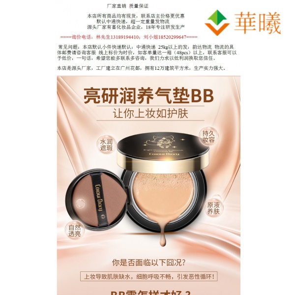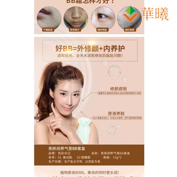 Hua xi welcomes you, meet is the fate, thank you for coming to the shop Brand type national goods brand No imports Brand color diary/color diary Suitable for skin quality No sunscreen Color like white muscle Color pink muscle Normal specifications Color diary light yan moist the air cushion bb cream Special purpose cosmetics no Cargo no. s0147 Whether cross-border exports are intended solely for source no Non special cosmetic record number guangdong g makeup net preparation word 2019168420 Category bb cream Quality assurance of direct sales by manufacturers All the goods in our shop are available, Source manufacturers are happy cosmetic enterprises, 18 years focus on r & d production 。