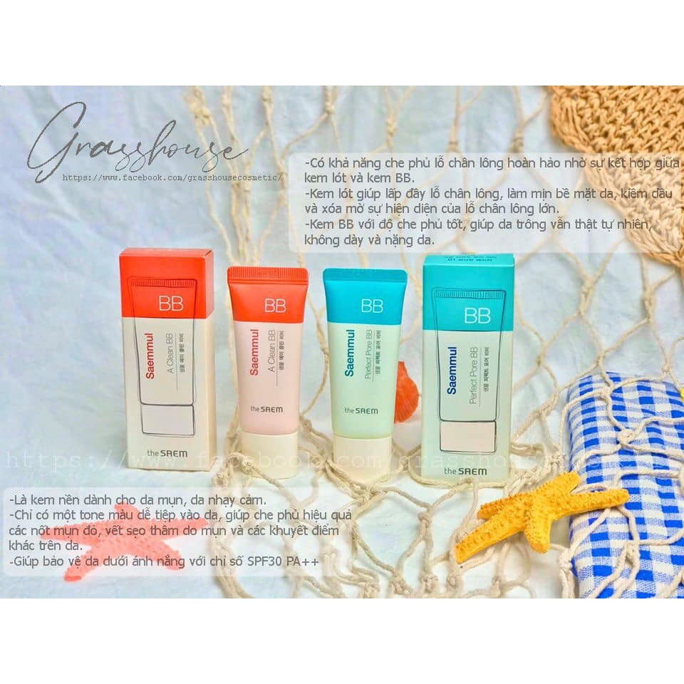💧🌼 KEM NỀN THE SAEM BB CREAM 🌼💧 💦Trọng lượng : 15ml 🏭 Xuất xứ : Hàn Quốc 🌵The Saem Saemmul Perfect Pore BB SPF30 PA++ : ☑️Có khả năng che phủ lỗ chân lông hoàn hảo nhờ sự kết hợp giữa kem lót và kem BB. ☑️Kem lót giúp lấp đầy lỗ chân lông, làm mịn bề mặt da, kiềm dầu và xóa mờ sự hiện diện của lỗ chân lông lớn. ☑️Kem BB với độ che phủ tốt, giúp da trông vẫn thật tự nhiên, không dày và nặng da. ☑️Kết cấu thiên hướng gel giúp lớp nền trông vẫn tự nhiên tuyệt đối dù tán nhiều lớp kem để có được độ che phủ như ý muốn. ☑️Chứa dưỡng chất hoa sen, thảo mộc và nước khoáng sâu, bổ sung Ceramide, hyaluronic acid và phức hợp dưỡng ẩm Moist 24 giúp dưỡng ẩm cho da suốt 24 giờ. 🌵The Saem Saemmul A Clean BB SPF30 PA++ : ☑️Là kem nền dành cho da mụn, da nhạy cảm. ☑️Chỉ có một tone màu dễ tiệp vào da, giúp che phủ hiệu quả các nốt mụn đỏ, vết sẹo thâm do mụn và các khuyết điểm khác trên da. ☑️Thành phần dịu nhẹ với chiết xuất từ Madecassoside (Rau Má) và chất dẫn xuất Vitamin E giúp chăm sóc da mụn, da nhạy cảm; không gây kích ứng cho da, duy trì làn da khỏe mạnh. ☑️Giúp bảo vệ da dưới ánh nắng với chỉ số SPF30 PA++ ---------------------------------♥------------------------------- 🏠 Địa chỉ: 202/10 Nguyễn Tiểu La , Phường 8, Quận 10 ☎️ Điện thoại: 0933 64 66 20 ⏰ Giờ mở cửa : 10H - 22H ( khách qa khung giờ 23H hẹn shop nhé )
