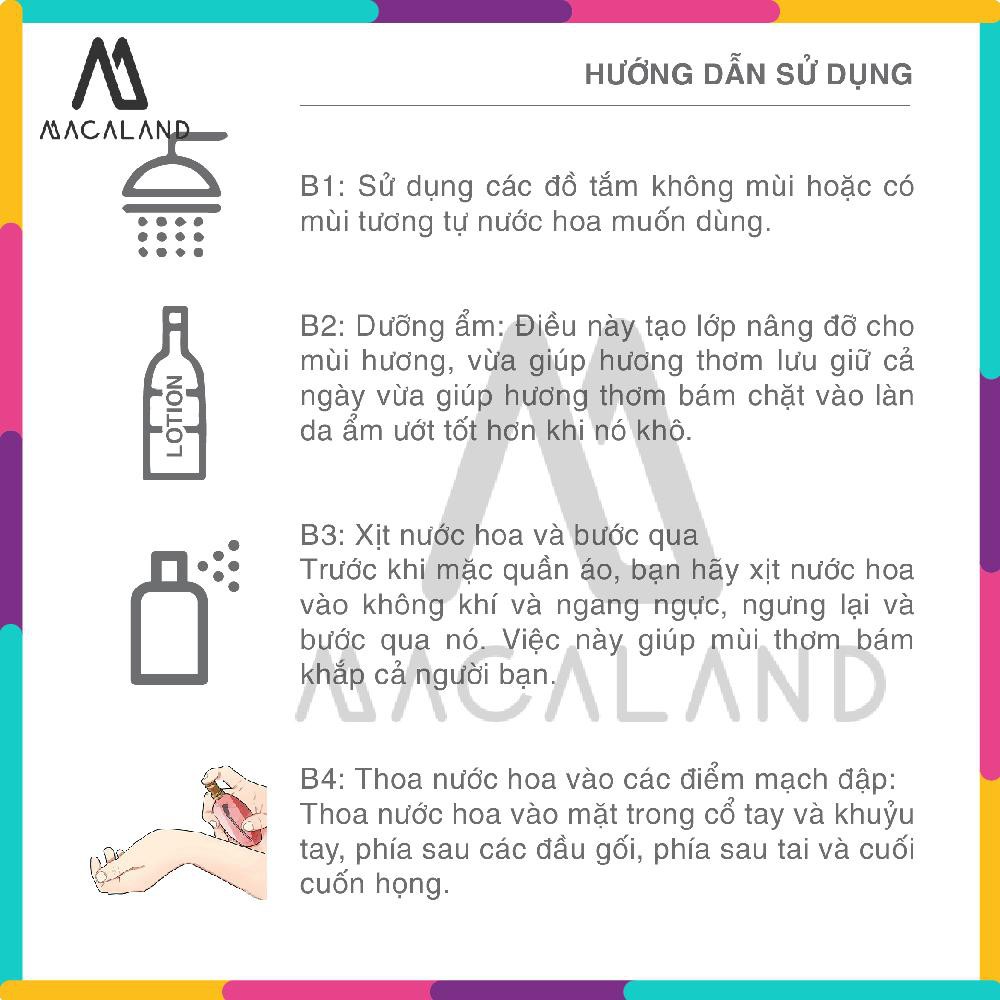 **MACALAND là thương hiệu nước hoa cao cấp được sản xuất theo công nghệ François Merle-Baudoin của người Pháp với đủ mùi hương dành cho cả nam và nữ. **Nước hoa nữ Charming Roman MACALAND là loại nước hoa đặc biệt dành cho nữ ưa thích phong cách sang trọng, nữ tính, thanh lịch. Phù hợp cho những quý cô văn phòng từ 25-35 tuổi, một sự thu hút, gợi cảm đến từ Charming Roman mùi hương tự nhiên. -Dung tích: 22ml -Quy cách: dạng chai xịt -Xuất xứ: Việt Nam 1) Công dụng: - Đem lại hương thơm ngọt ngào, quyến rũ giúp cho các cô gái luôn hấp dẫn và tự tin trong mắt người đối diện. - Độ lưu hương lâu, khó phai với 3 tầng hương. 2) Thành phần: Alcohol, Aqua, Parfum, Peg-40 Hydrogenated Castor Oil. 3) Hướng dẫn sử dụng: - Xịt nước hoa lên các vị trí dễ lưu hương trên cơ thể: + Sau tai: Do cấu tạo vị trí phía sau tai với những mạch máu nằm gần sát dưới da, do đó mức nhiệt ở đây cao hơn. Bởi thế, chúng được coi là “điểm mạch” giúp mùi hương thêm nồng nàn. + Lưng: Lưu nước hoa ở vùng lưng sẽ giúp hương thơm bền mùi hơn và mọi người xung quanh sẽ cảm thấy mùi hương không quá nồng. + Bên trong khuỷu tay: Với vị trí này, bạn cần tối ưu hóa sự khuếch tán của các phân tử hương bằng cách dưỡng ẩm cánh tay trước khi lăn nước hoa. + Rốn: Có một vị trí ngay trên cơ thể nhưng có thể bạn không bao giờ ngờ tới. Đó chính là nhỏ vài giọt nước hoa lên ngón tay hoặc lăn chúng vào vùng dưới cánh tay và vào nhất là vào rốn của bạn. Hương thơm nước hoa sẽ lưu giữ cực kỳ lâu dài. + Sau đầu gối: Giống như khuỷu tay, vị trí sau đầu gối là một trong những điểm mạch, vì thế nơi này là điểm hợp lý nhất để lưu nước hoa trên đôi chân của bạn. Khi bạn di chuyển, hương thơm sẽ giúp nước hoa thơm ngát quanh bạn. + Trên mắt cá chân: Ở vị trí càng di chuyển nhiều, mùi hương trên cơ thể bạn càng sẽ lan tỏa theo từng bước đi. Đó là lý do nên dùng nước hoa lên hai mắt cá chân. 4) Công thức nổi bật: - Được sản xuất tại Việt Nam, theo công nghệ François Merle-Baudoin của người Pháp. Mùi hương nhẹ nhàng nhưng vô cùng độc đáo với 3 tầng hương: * Hương đầu (top notes): tinh dầu chanh, táo, mâm xôi, dứa. * Hương giữa (middle notes): tinh dầu hoa nhài, hoa hồng. * Hương cuối (base notes): tinh dầu vani, caramel, gỗ tuyết tùng, gỗ đàn hương, xạ hương. 5) Điều Kiện Bảo Quản: - Để nơi khô ráo, thoáng mát. Tránh ánh nắng trực tiếp, nơi có nhiệt độ cao hoặc ẩm ướt. Vặn nắp kín sau khi sử dụng. ***Lưu ý: Sản phẩm chỉ sử dụng ngoài da. Tránh vùng da bị tổn thương, vết trầy xước. Đặc biệt không nên xịt lên quần áo trắng vì sẽ dễ gây ố màu quần áo. --------------------------------------------------- MACALAND - Chuyên các sản phẩm chiết xuất từ thiên nhiên cam kết với khách hàng: * Sản phẩm 100% giống mô tả, chỉ tiêu kích ứng thấp, an toàn tuyệt đối cho da kể cả da nhạy cảm. * Được sản xuất và kiểm nghiệm và công bố của bộ y tế đầy đủ. * Đảm bảo chất lượng, dịch vụ tốt, hàng được giao từ 1-3 ngày kể từ ngày đặt hàng. * Giao hàng toàn quốc - nhận hàng trả tiền. * Đổi trả theo quy định của Shopee.