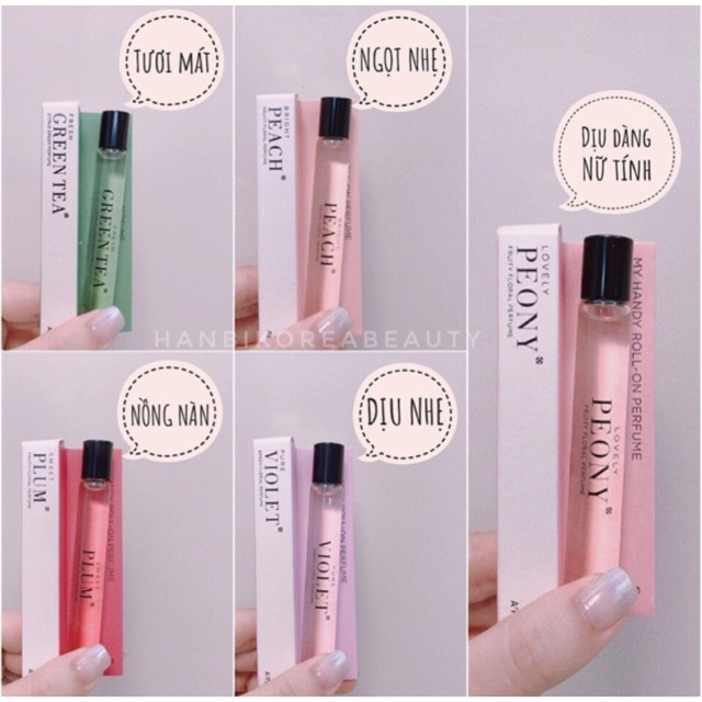 Nước hoa nhà Hanbi vẫn có sẵn Mùi PEACH, PLUM, PEONY, VIOLET, GREENTEA Thanh dạng lăn dễ dàng sử dụng, dung tích 10ml Giá only #95k 🤗 Rẻ mà siêu có võ 😌