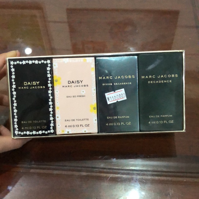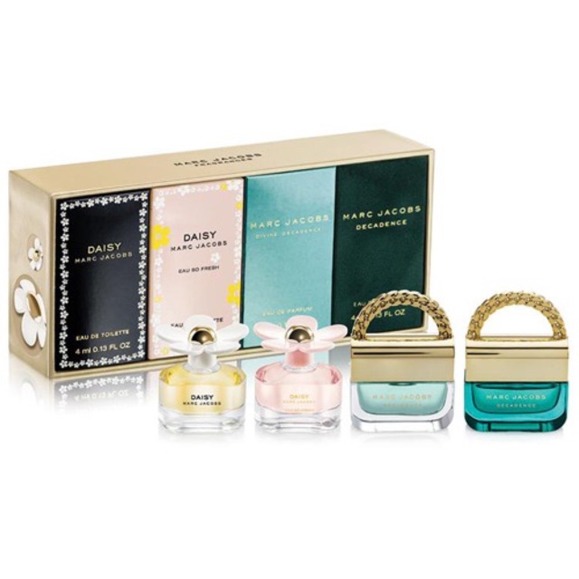 Thương hiệu: Marc Jacobs Nồng độ : Eau De Toilette (EDT) và Eau De Parfum Dung tích: 4ml Xuất xứ : Mỹ Gồm 4 chai 4 mùi khác nhau EDT Daisy Eau so fresh EDP Divine Decadence EDP Decadence