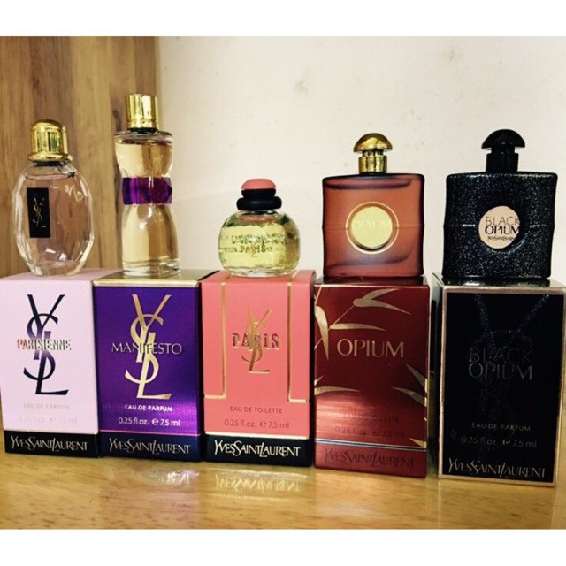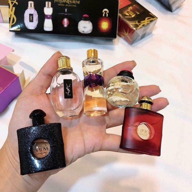 Set 5 chai nước hoa nữ YSL 8ml Giá : 172k/set 7,5ml/chai Năm mùi hương mang năm phong cách nữ tính khác nhau từ : - diệu dàng ngọt ngào - Trẻ trung tươi tắng - Quyến rũ say đắm Sẽ làm bạn cảm thấy mình lúc nào cũng được tươi mới và phá cách. Set chai 7,5ml tiện lợi đem theo đi du lịch.