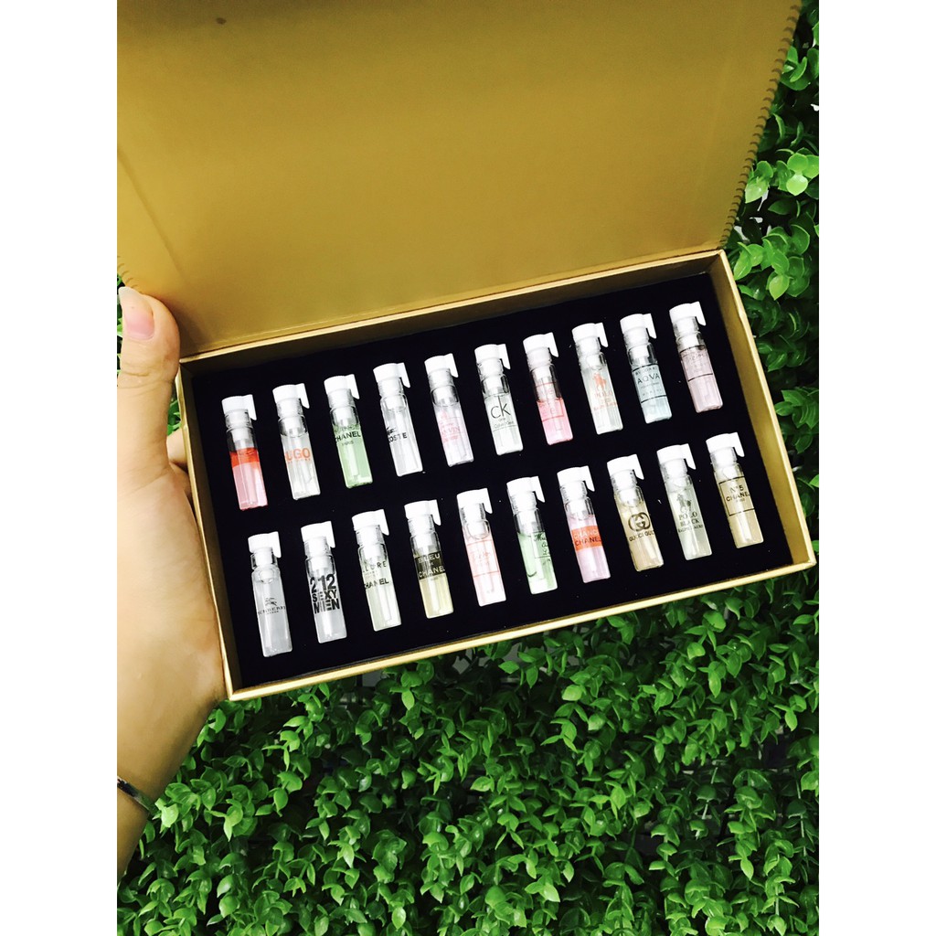 MÔ TẢ SẢN PHẨM Bộ 20 chai nước hoa mini hàng test. - Nhiều mùi hương từ nhẹ nhàng trong trẻo đến nồng nàn, quyến rũ hay mạnh mẽ cá tính. - Với bộ chai nước hoa mini này bạn sẽ có nhiều lựa chọn cho từng thời điểm cần thiết. - Chai dung tích 2ml dạng chấm giúp tiết kiệm nước hoa, tiện để chấm vào vùng cổ, tay... - Chai nhỏ gọn tiện lợi cho bạn mang theo mọi nơi. - Lọ nước hoa test được chiết từ nước hoa Pháp với nhiều thương hiệu rất hữu ích khi bạn muốn thử xem mùi hương nào phù hợp với mình. - Ngoài ra, trong bộ có 1-2 chai mùi mạnh dành cho nam nên phù hợp cho cả gia đình bạn.