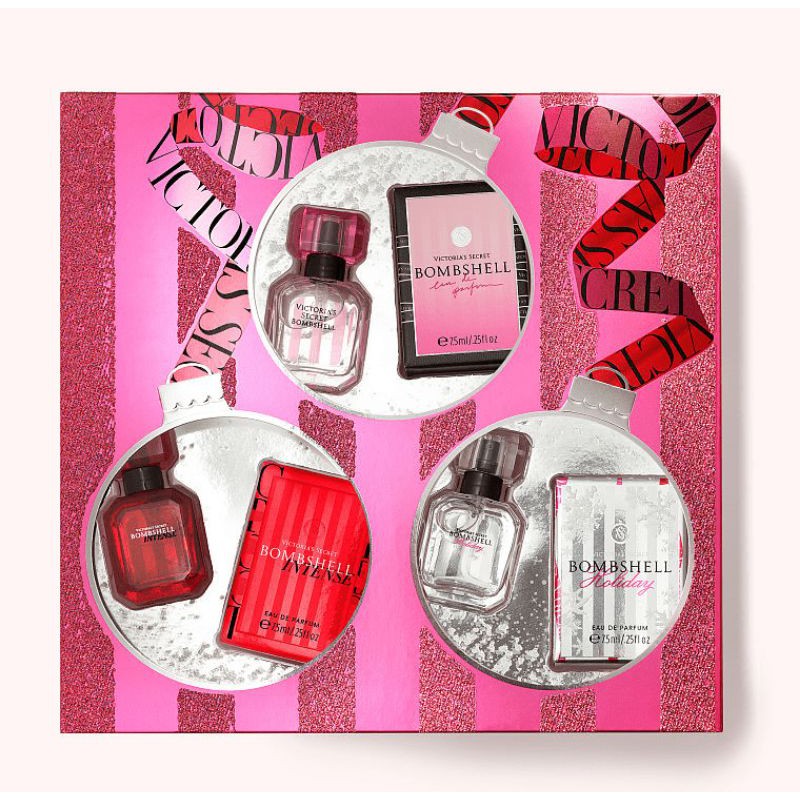 Set Nước Hoa Victoria's Secret Bombshell phiên bản giáng sinh năm nay: Bộ nước hoa xinh xắn đáng yêu, với mùi hương gợi cảm, đầy quyến rũ và khiêu khích cùng cảm xúc thăng hoa với 3 mùi nổi bật nhất của hãng. Set này rất phù hơp khi làm quà tặng trong dịp sinh nhật, hay hẹn hò. Gift set gồm 3 sản phẩm nước hoa : Victoria's Secret BOMBSHELL EDP 7.5ml Victoria's Secret BOMBSHELL INTENSE EDP 7.5 ml Victoria's Secret BOMBSHELL HOLIDAY 7.5 ml