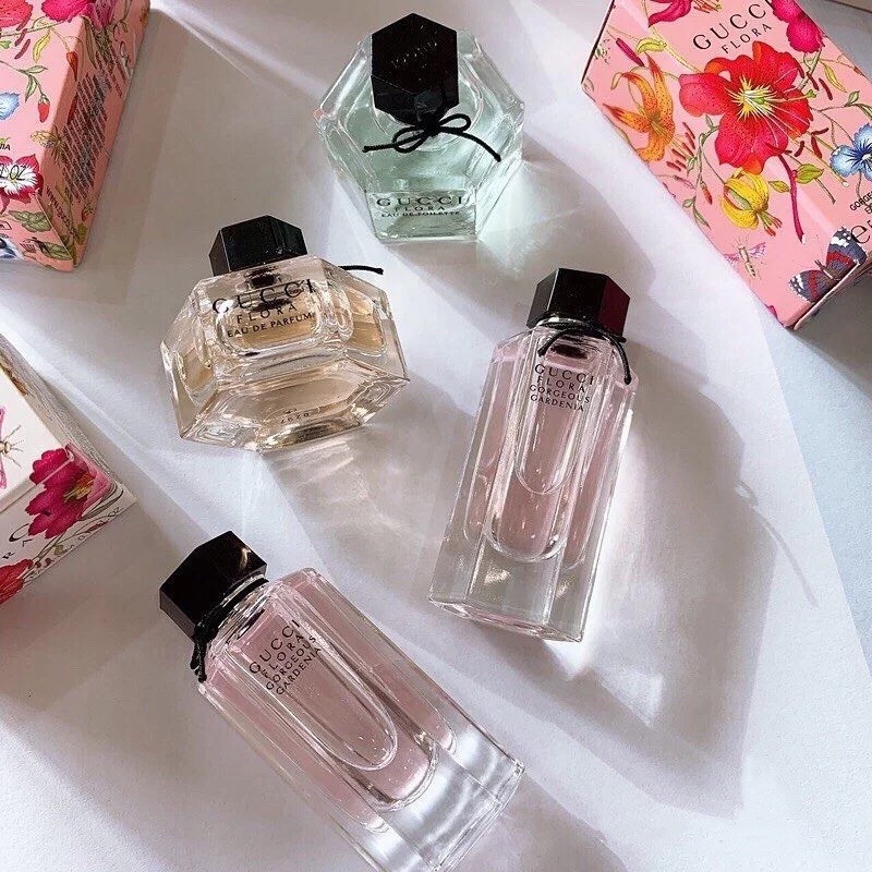 Nhà có sẵn set nước hoa Gucci Flora . Set gồm có: - 01 chai Flora Eau de parfum (5ml) - 01 chai Flora Eau de toilette (5ml) - 02 Flora Garden Gorgeous Gardenia Eau de toilette (5ml) . Flora by Gucci Eau de parfum & Eau de toilette là những mùi hương hoàn toàn nữ tính và đầy gợi cảm dành cho phụ nữ. Lấy cảm hứng từ những họa tiết hoa lá biểu tượng của nhà Gucci, Những lọ nước hoa được định danh bởi sự tương phản giữa nét cổ điện và hiện đại của cô nàng Gucci với tinh thần trẻ trung, nữ tính. . Flora Gorgeous Gardenia vô cùng nịnh mũi với sự nhẹ nhàng của đóa hoa bụi trong lớp hương đầu tiên và sự đậm đà, kích thích gây nghiện khi lớp hương giữa nở rộ. Hương thơm Flora này cũng có các nốt hương đầu của quả berry mọng đỏ và lê, trong khi các nốt hương giữa bao gồm cây sơn chi trắng, hoa frangipani, và một nền nước hoa gợi cảm của hoắc hương và đường nâu