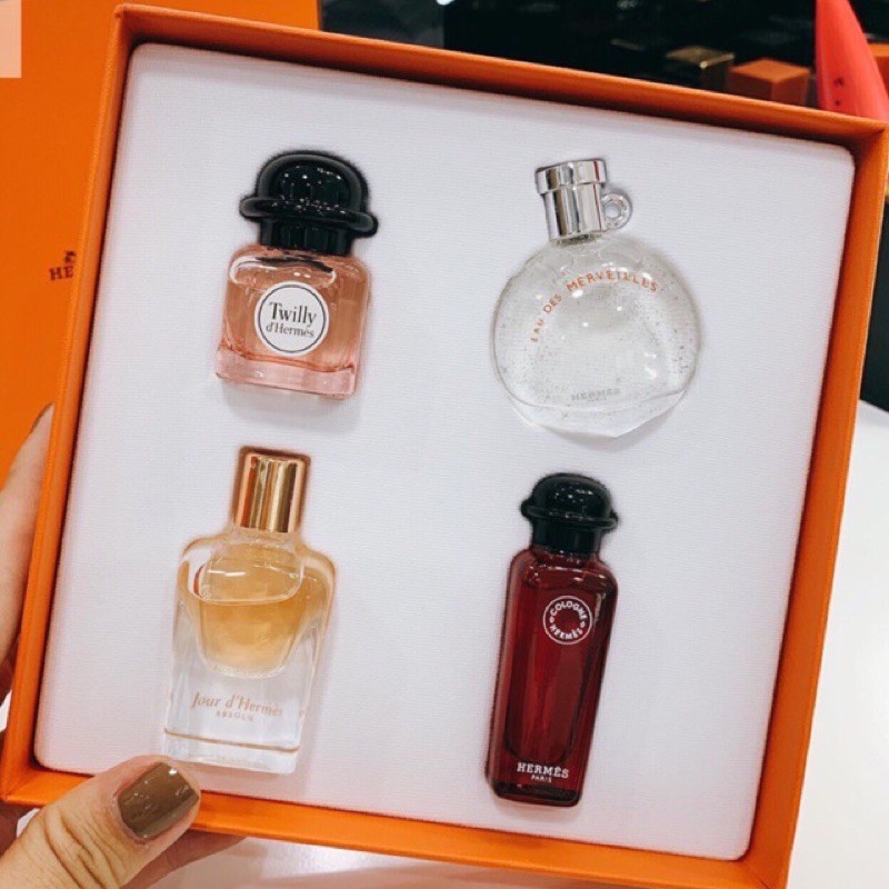 ❄️Ưng quá đi ... về kịp cho các chị đây ạ , dùng mùa này thì phê rồi❄️ 💥SÉT NƯỚC HOA MINI HERMES 💥 💕Hàng cập bến chưa kịp up date mà bán cũng gần hết rồi . HÓT QUÁ MÀ. 🌹Rất hiếm khi có được 1 sét hội tụ đủ 4 mùi hót hít nhất của nhà Hermes như thế này . 💥Thơm , sang chảnh, đỉnh của đỉnh e nghiện cả 4 mùi này luôn á. 🌼 dung tích : 7,5x4/ chai 🍭hermes twilliy 🍭hermes eau des merveilles 🍭Hermes jour 🍭Hermes eau de cologe
