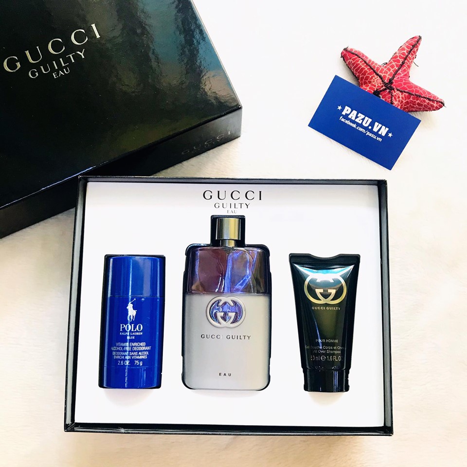 SET GUCCI GUILTY EAU Gồm: - Chai nước hoa Gucci Guilty90ml - Chai sữa tắm gội 50ml - Chai lăn khử mùi Polo Blue 75ml (Polo Blue là một món quà từ Ralph Lauren muốn gửi tới những chàng trai trẻ năng động, tự tin, yêu tự do và luôn tràn đầy năng lượng sống. Một hương thơm lí tưởng cho mùa hè và những lúc bạn cần “lên dây cót” cho tinh thần mình. Khởi đầu với hương dưa lưới Cavaillon, quýt đỏ và dưa leo tươi mát không ngờ, Polo Blue tiếp tục làm bạn phấn chấn hơn với tầng hương giữa gồm phong lữ, húng quế và ngải đắng thể hiện sự nam tính; cuối cùng là tầng hương êm dịu của gỗ thơm, xạ hương và da lộn Thuỵ Điển. ) Mùi hương đặc trưng: - Hương đầu: Chanh, cam Bergamot. - Hương giữa: Gỗ orris, hoa cam. - Hương cuối: Hoắc hương, xạ hương. Phong cách: Tinh tế, mạnh mẽ, thanh lịch. ================= Ship hàng toàn quốc. CUNG CẤP SỈ & LẺ NƯỚC HOA, MỸ PHẨM, THỰC PHẨM CHỨC NĂNG NHẬN ORDER HÀNG MỸ - ÚC - NHẬT - ANH Website: Pazu.vn Hotline: 0939.658.608 Add: 448/1 Trần Hưng Đạo, P.2, Q.5, Tp.HCM
