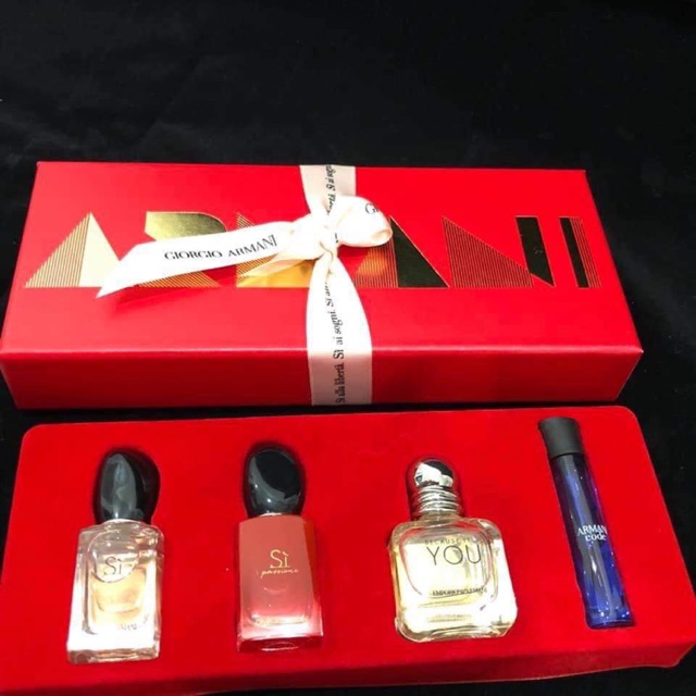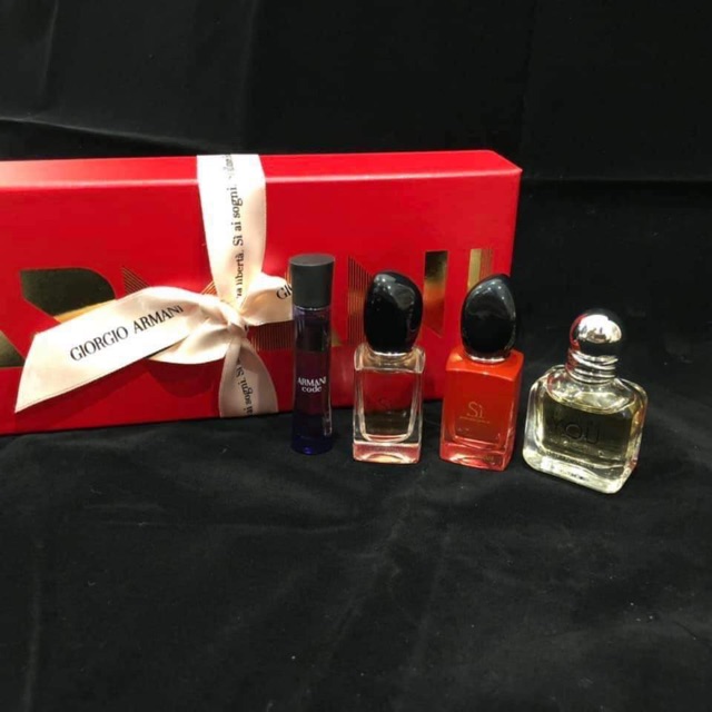 -- Set nước hoa nữ mini Giorgio Armani 7ml -- Bộ sản phẩm gồm 4 chai nước hoa: ✔ Giorgio Armani Si For Women ✔ Giorgio Armani Si Passione For Women ✔ Giorgio Armani Emporio Armani Because It’s You ✔ Giorgio Armani Code Ultimate For Women Thiết kế hộp đựng đỏ tươi đặc biệt cá tính, làm quà tặng thì cực sang chảnh nhé 🌸 Một chai mini Sì thôi đã ~500k rồi nên set này 4 chai mà chỉ có 1xxx là cực tiết kiệm luôn 😁