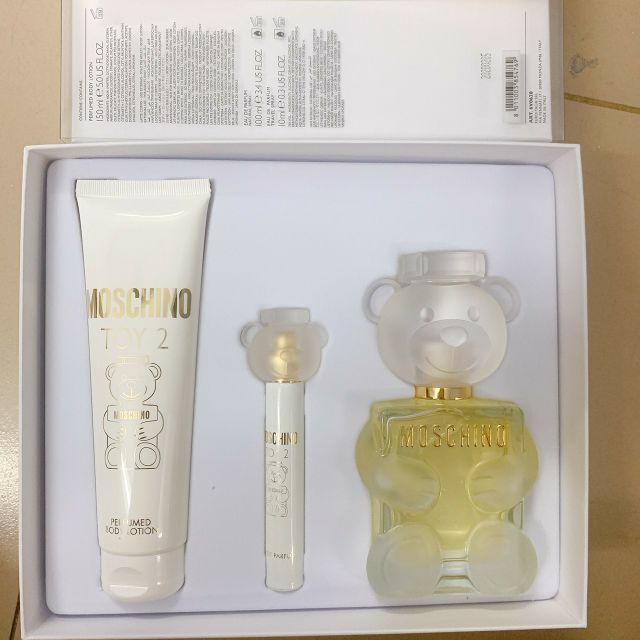 🐻 SET- Moschino Toy 2 EDP 🐻 💰💰 GIÁ: 1.600k / set, Gồm ⚡️ Moschino Toy 2 EDP 100ml ⚡️ Mini Moschino Toy 2 EDP 10ml ( dạng xịt) ⚡️ Body lotion 150ml Đây là dòng nước hoa Moschino thuộc nhóm Floral Woody Musk nhom Hương hoa cỏ Gỗ-Xạ hương. Toy 2 được cho ra mắt vào năm 2018. Hương Quả táo xanh và Hoa mẫu đơn là hai hương bạn có thể dễ dàng cảm nhận được nhất khi sử dụng nước hoa này.