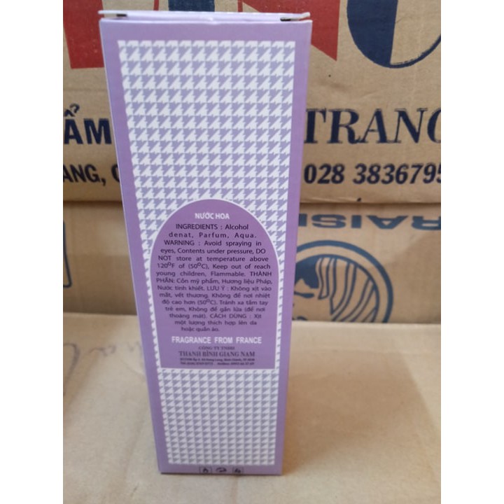 Thành Phần:Alcohol dental,Parfum,Aqua Cảnh Báo:Tránh để nước hoa vào mắt,vết thương ,ko để nhiệt độ 50 độ C,Tránh xa tầm tay trẻ em ,ko để gần lửa Cách Dùng:xịt 1 lượng thích hợp lên da và quần áo Trọng Lượng :100g lưu hương đươc 12 tiếng
