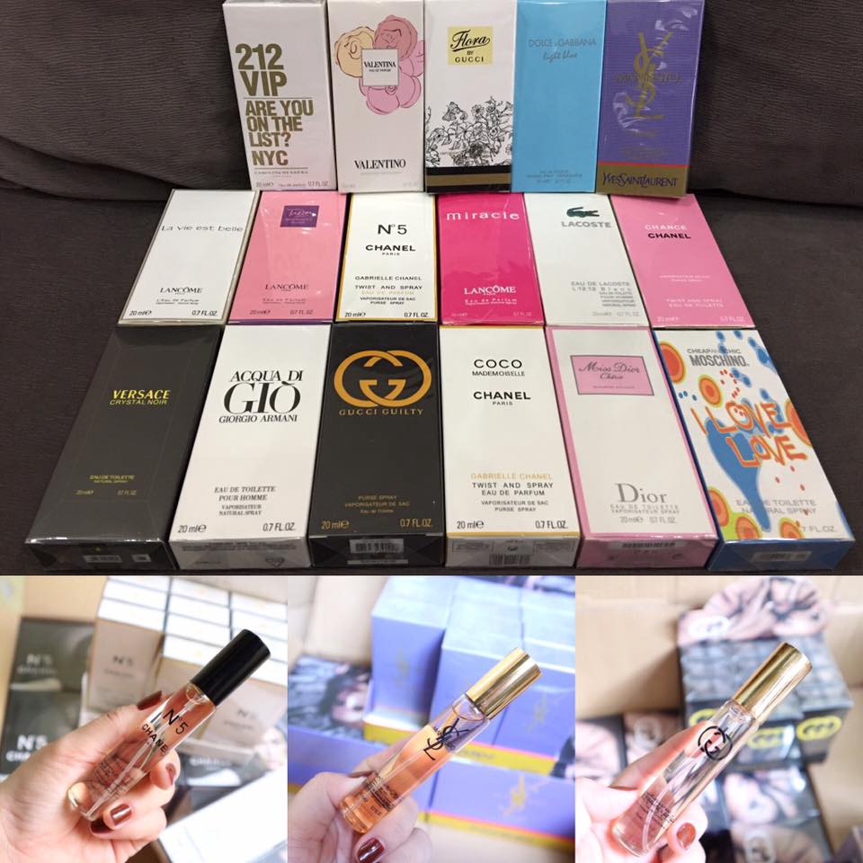 - Daisy Dear: Bản dupe hoàn hảo của thương hiệu Marc Jacob với hương thơm tươi mát, ngọt ngào, mịn màng từ chiết xuất hoa cúc dành cho các bạn nữ sử dụng trong những ngày hè nóng ẩm đầu năm. Độ tỏa hương gần, rất tuyệt vời cho môi trường làm việc văn phòng. - Gogo Chanale: bản dupe hoàn hảo của thương hiệu nổi tiếng thế giới coco chanel với hương thơm như khúc nhạc Baroque trữ tình du dương bên cạnh bạn. Hãy cho bản thân thử thưởng thức và cảm nhận hương thơm kì diệu đầy quyến rũ này. Phong cách: Quý phái, bí ẩn, lôi cuốn, tự tin, thanh lịch. Nhóm hương: Hương hoa cỏ Gỗ - Xạ hương. - Silver Mountain Water: dòng nước hoa unisex có phần nam tính, song hương thơm lại tươi mát một cách độc đáo. Sản phẩm rất thích hợp khi sử dụng vào ban ngày cho những dịp đạo phố. Các lớp hương sắc nét & tinh khiết làm cho Silver Mountain Water càng thêm sang trọng và dễ làm hài lòng người dùng. Mùi hương của Silver Mountain Water sẽ đem bạn đến những ngọn núi tuyết, nơi có không khí mát lạnh và trong lành. - Chenale Blue: Mùi hương gỗ thơm nồng dành cho nam giới, mang lại cho phái mạnh một sự sang trọng, lịch lãm đầy lôi cuốn. Độ lưu hương khá lâu. Ngoài ra, mùi hương này còn phù hợp với những bạn nữ năng động có cá tính mạnh mẽ. - JeanMiss party: mùi hương đam mê cho các nàng tiệc tùng phá cách - Jean Miss Lady: truyền đến cảm hứng về một tình yêu đặc biệt và vui tươi. Hương thơm đại diện cho sự tự do và quyến rũ, đặc trưng bởi sự duyên dáng và khả năng làm say đắm lòng người. Nhóm hương : Hương Hoa cỏ Síp - Chypre Floral - Angel: Mùi hương đặc trưng: Vani, mật ong và cây đàn hương, hoa thảo mộc. Phong cách: Lãng mạn, quyến rũ. Độ tỏa hương: Thoang thoảng trên làn da - Unicorn: Nước hoa nữ phù hợp với người trên 25 tuổi.Đây là dòng nước hoa có độ lưu hương từ 3 giờ đến 6 giờ. và độ tỏa hương thuộc dạng rất gần - thoang thoảng trên làn da. Đây là dòng nước thuộc nhóm Floral Green (Hương hoa cỏ xanh tự nhiên).Bên cạnh đó, Hương lục và Hoa tím là hai hương bạn có thể dễ dàng cảm nhận được nhất khi sử dụng nước hoa này. "- Miao Miao: Phong cách: nữ tính, Hiện đại, trẻ trung, tinh tế Hương đầu: hoa huệ thung lũng, quả cam, quả chanh. Hương giữa: hoa nhài, hoa hồng, note hương màu xanh lá cây, quả lý chua đen, quả đào. Hương cuối: HOA XẠ HƯƠNG TRẮNG , GỖ. "- Black Skirt: Phong cách: Sang trọng , Quý phải Hương Đầu: Cam Bergamot, Hạnh nhân, Quả anh đào chua, Trái cây đỏ Hương giữa: Hoa hồng, Trà, Hoa hồng Taif, Cam thảo Hương cuối: Tiểu hồi hương, Đậu Tonka, Hương Va ni, Cây hoắc hương, Hoa diên vĩ" - Land Rose No man: mùi thơm với hương hoa hồng quyến rũ khiến người đối diện đắm say từ cái nhìn đầu tiên Còn rất nhiều mùi khác nữa nhak các chế, shop giao mẫu ngẫu nhiên ạ