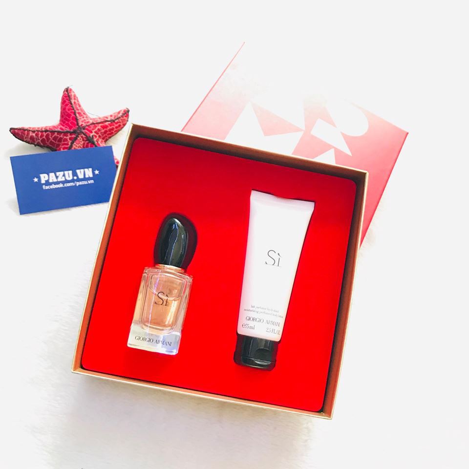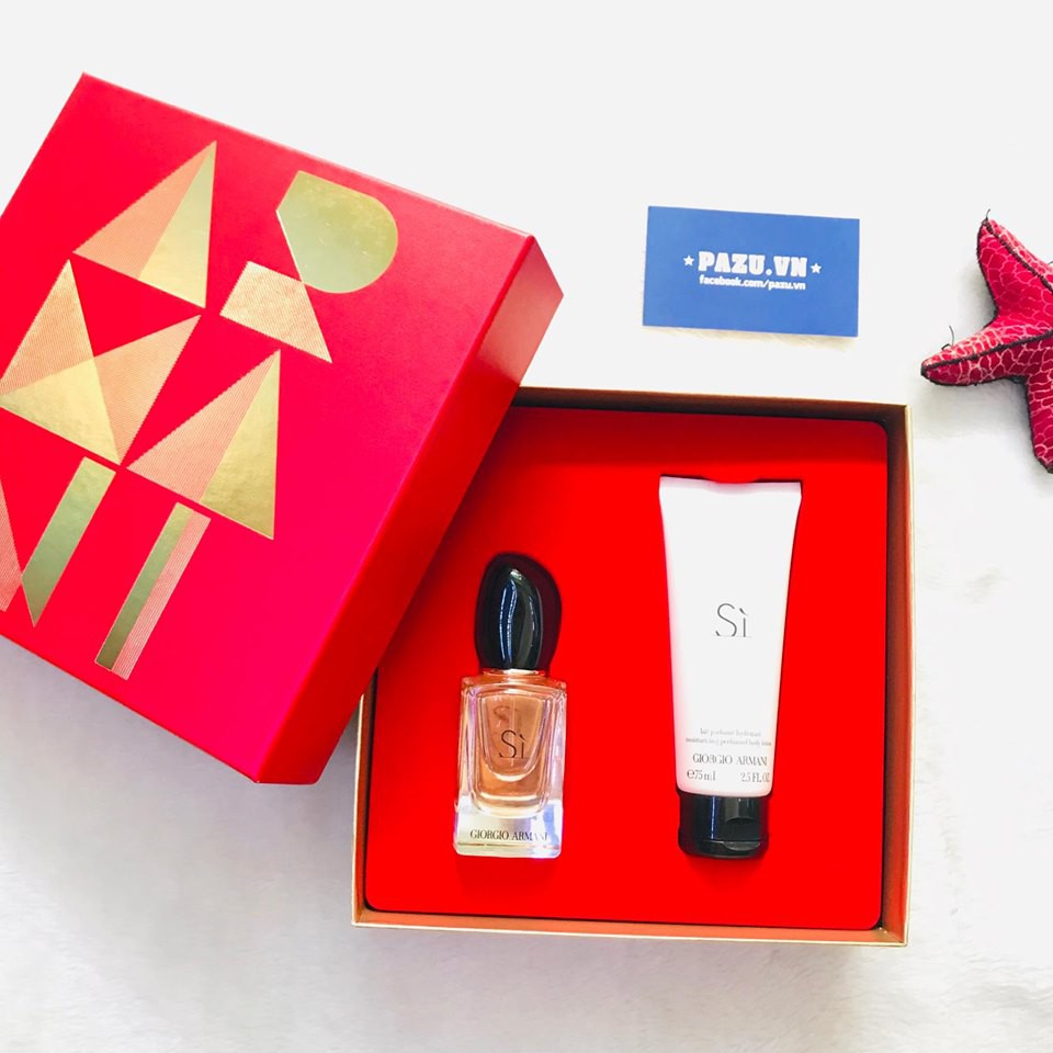 Set Sì Giorgio Armani Eau De Parfum Gồm: - Nước hoa Sì EDP 30ml - Lotion Sì 75 ml Giorgio Armani Sì Eau de Parfum với hương sắc vô cùng ngọt ngào , trẻ trung và quyến rũ. Mùi hương sẽ khiến bạn trở nên cuốn hút hơn, và chắc chắn những những anh chàng vây quanh bạn không thể không buông lời khen ngợi, Mùi hương đặc trưng: – Hương đầu: cây lý đen. – Hương giữa: hoa lan Nam Phi, hoa hồng. – Hương cuối: hương vani, hoắc hương, ambroxan, hương gỗ. Phong cách: nữ tính, gợi cảm, cuốn hút. ========================== Ship hàng toàn quốc. CUNG CẤP SỈ & LẺ NƯỚC HOA, MỸ PHẨM, THỰC PHẨM CHỨC NĂNG NHẬN ORDER HÀNG MỸ - ÚC - NHẬT - ANH Website: Pazu.vn Hotline: 0939.658.608 Add: 448/1 Trần Hưng Đạo, P.2, Q.5, Tp.HCM