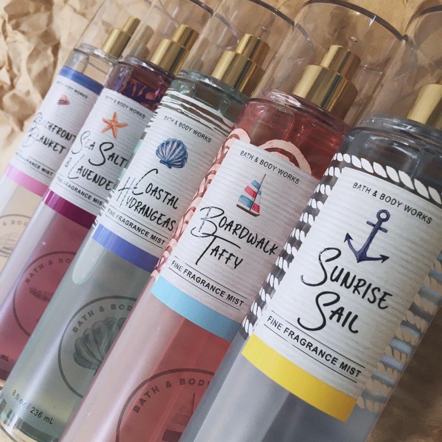 Xịt thơm Bath and Body Works Fine Fragrance Mist là sản phẩm xịt thơm toàn thân nổi tiếng đến từ Mỹ với đa dạng mùi hương từ hương thơm sang trọng đến những mùi hương ngọt ngào, tươi mát, đều rất lôi cuốn và phù hợp với sở thích, nhu cầu của nhiều khách hàng. Xịt thơm Bath and Body Works Fine Fragrance Mist được thiết kế chai nhựa cứng cáp, chắc chắn, vòi xịt phun sương giúp dễ dàng xịt đều khắp cơ thể. Bao bì bắt mắt và phù hợp với đặc trưng riêng của từng mùi hương. Xịt thơm được chiết xuất từ hoa cỏ thiên nhiên, mùi hương trái cây ngọt ngào, tươi mát giúp phái đẹp có mùi hương thu hút và hấp dẫn nhưng không bị quá nồng như nước hoa. Xịt thơm Bath and Body Works Fine Fragrance Mist giúp lưu giữ hương thơm khá lâu, có thể lên tới 5-6 giờ đồng hồ. Sản phẩm có thể xịt toàn thân, quần áo hoặc xịt vào tủ quần áo hay chăn gối của bạn. Xịt thơm còn có tác dụng làm mát da, cung cấp ẩm giúp da mềm mại, mịn màng chứ không hề gây khô da. ~ Sunrise Sail • Boardwalk Taffy • Coastal Hydrangeas • Sea Salt & Lavender • Beachfront Blanket