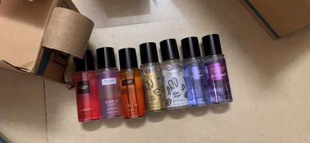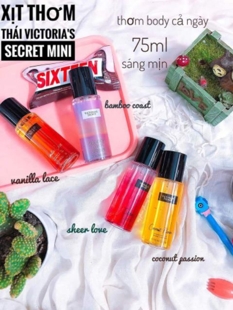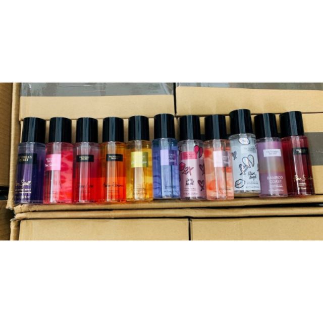 Thương hiệu: Victoria's Secret xuất xứ: Pháp Dung tích: 75ml ------------------------ Thiết kế: Chai nhựa cao cấp, dáng tròn tròn siêu đáng yêu và sang trọng <3 - Mùi hương: BST bao gồm 9 hương truyền thống luôn luôn "gây bão táp mưa sa" với cả 1 bộ sưu tập hương đa dạng: từ ngây thơ năng động, ngọt ngào, quyến rũ cho tới đầm thắm ma mị đến hút hồn sẽ tạo nên sự đam mê cuồng nhiệt cho chàng khiến chàng bị thu hút tuyệt đối đấy ^^. ** Mùi hương Sản phẩm sở hữu mùi hương đa số thuộc tone ngọt ngào, thu hút kỳ lạ. Mặc dù vậy nhưng em ấy không hề tạo cảm giác nồng, gắt , gây khó chịu cho những người xung quanh đâu do độ cồn không nhìu, độ bám hương cũng khá "đỉnh". Nên các bạn có thể thoải mái sử dụng thậm chí cả ban ngày..